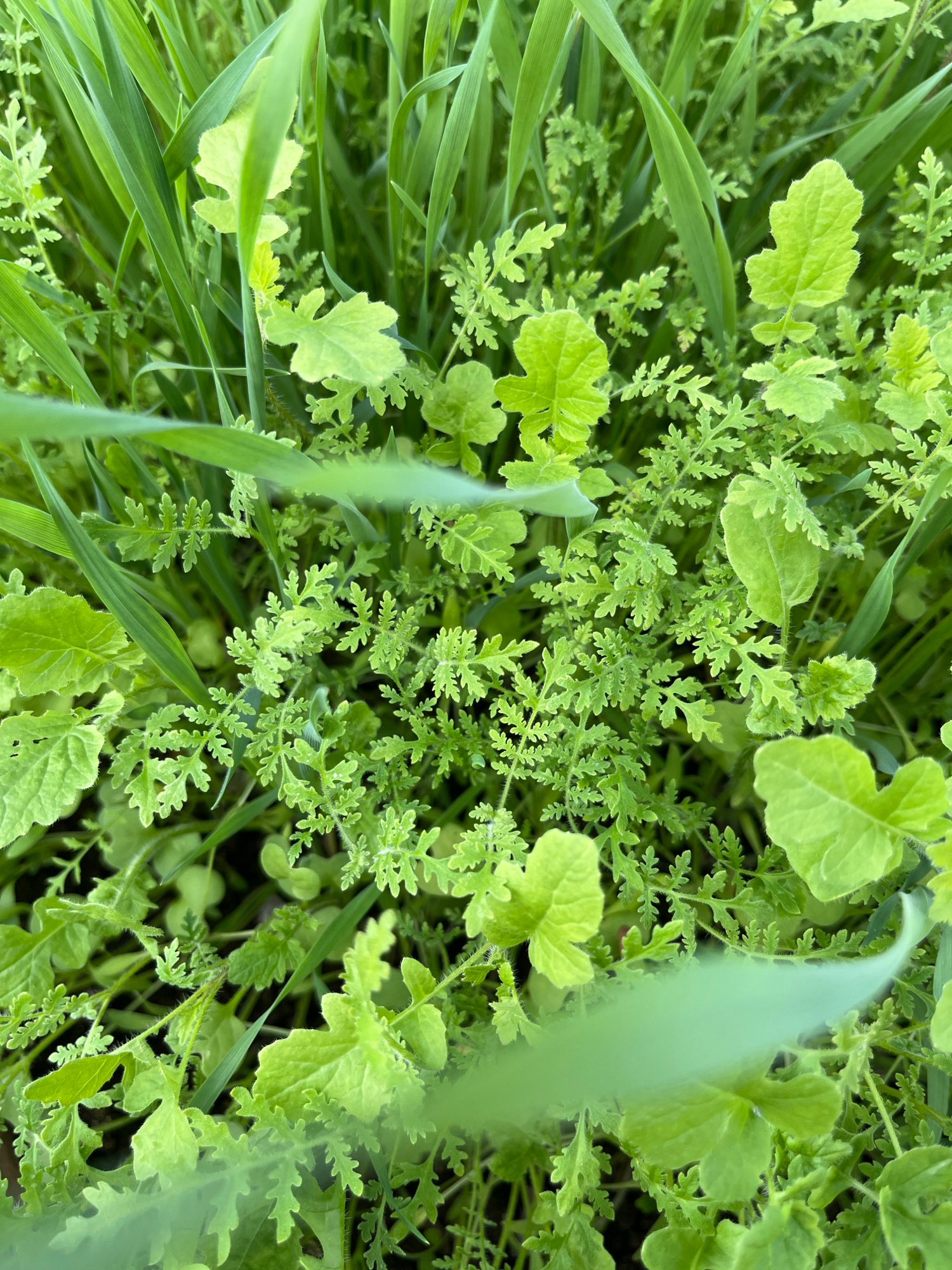 This close-up image captures a dense and vibrant patch of green foliage, dominated by a mix of plant types. The scene is an outdoor natural environment, possibly a field or garden in Chaikovsky, Russi…read more