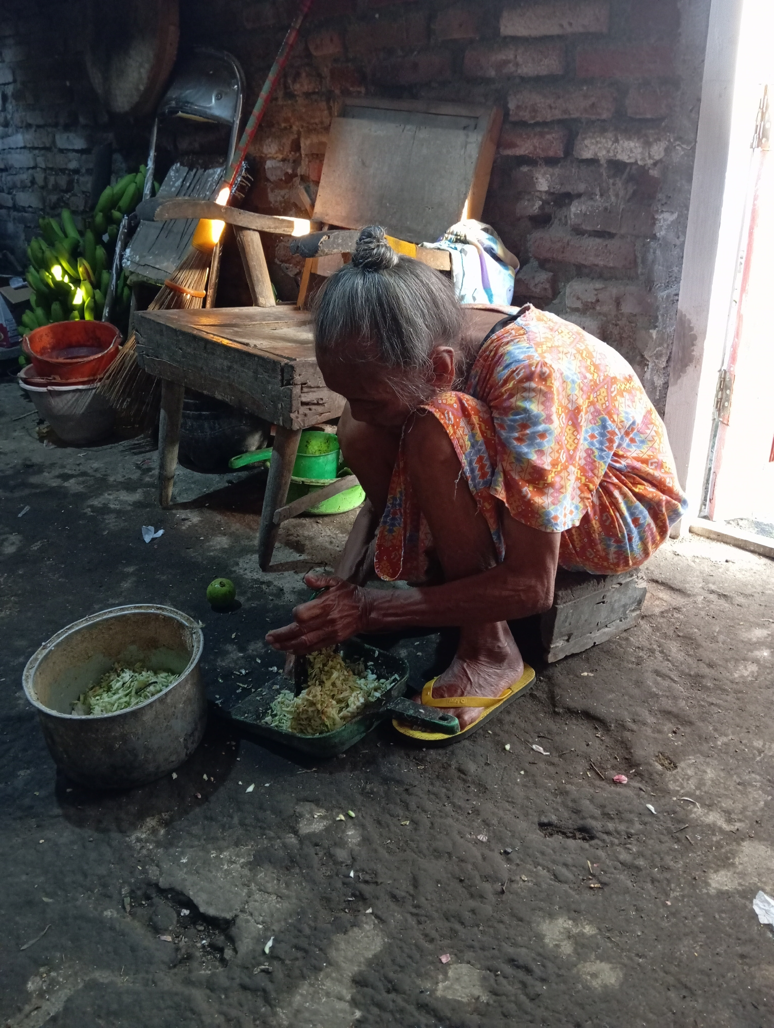 In a dimly lit, enclosed space, an elderly woman with gray hair pulled back into a bun is squatting on the ground. She wears a patterned orange and blue top and yellow sandals. She is actively shreddi…read more