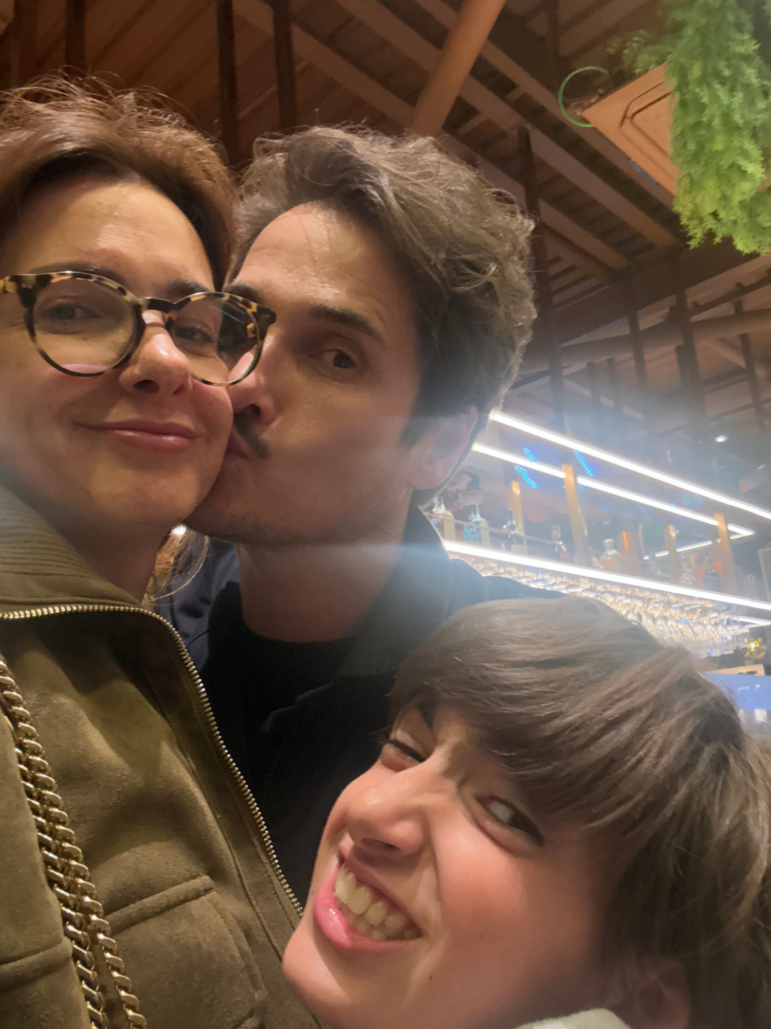 Three people are in the frame. The woman at the bottom left wears glasses and has short brown hair. A man with dark hair kisses her cheek. A child with short brown hair smiles to the right of the man.…read more
