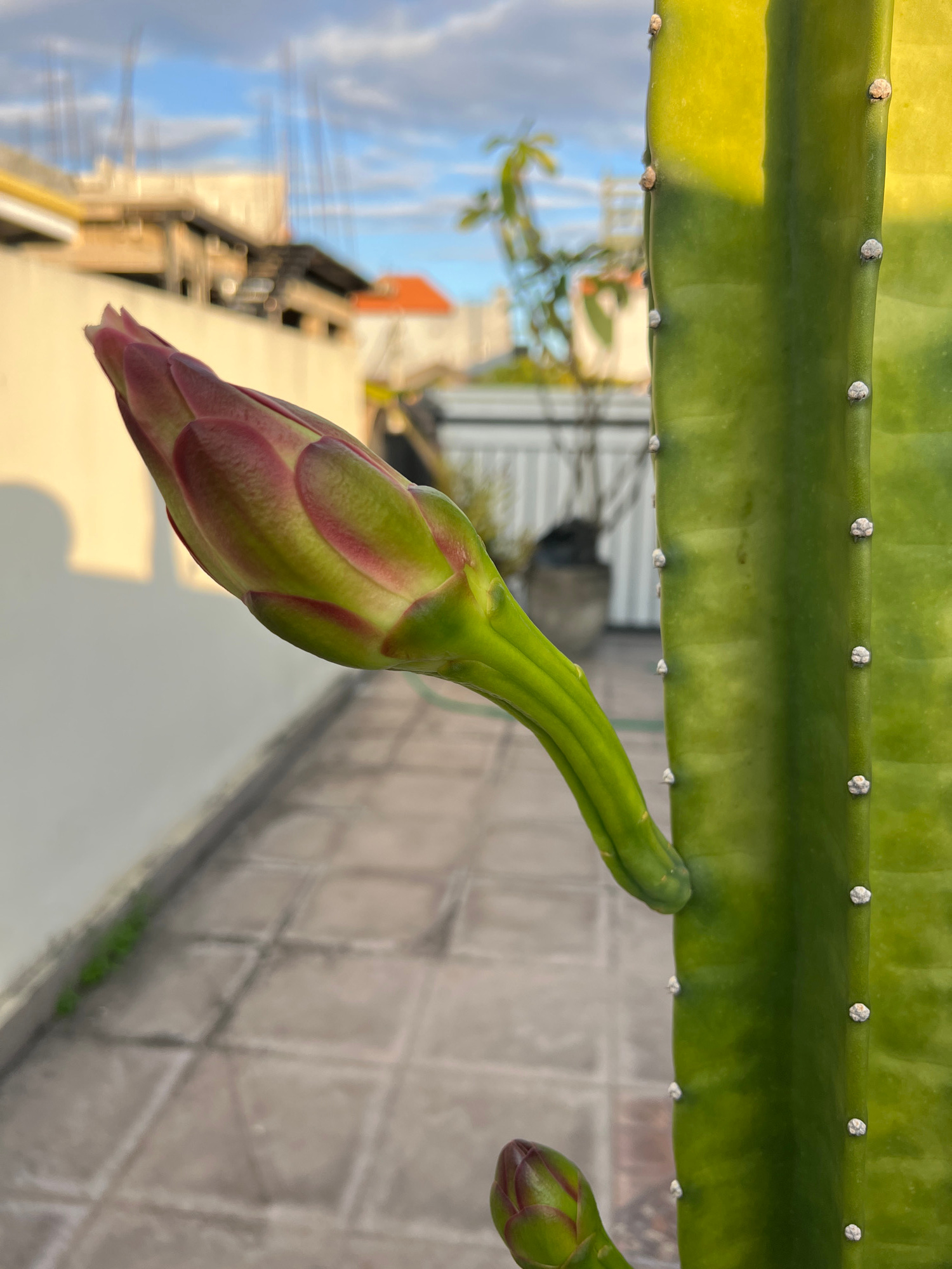 A close-up, brightly lit, outdoor shot depicts a green, cactus-like plant stalk growing horizontally across the top of the frame. The stalk has evenly spaced, small, round white points along its edges…read more