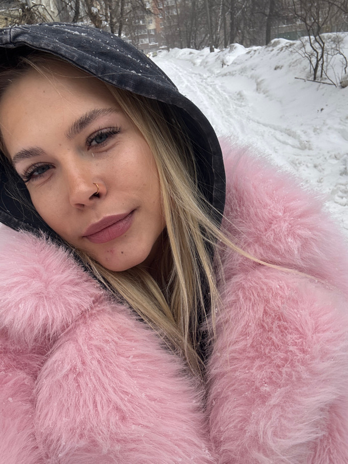 A young Caucasian female is depicted in a close-up, selfie-style portrait taken outdoors during winter in Reutov, Russia. She has blonde hair, light-colored eyes, and a small gold ring piercing on her…read more