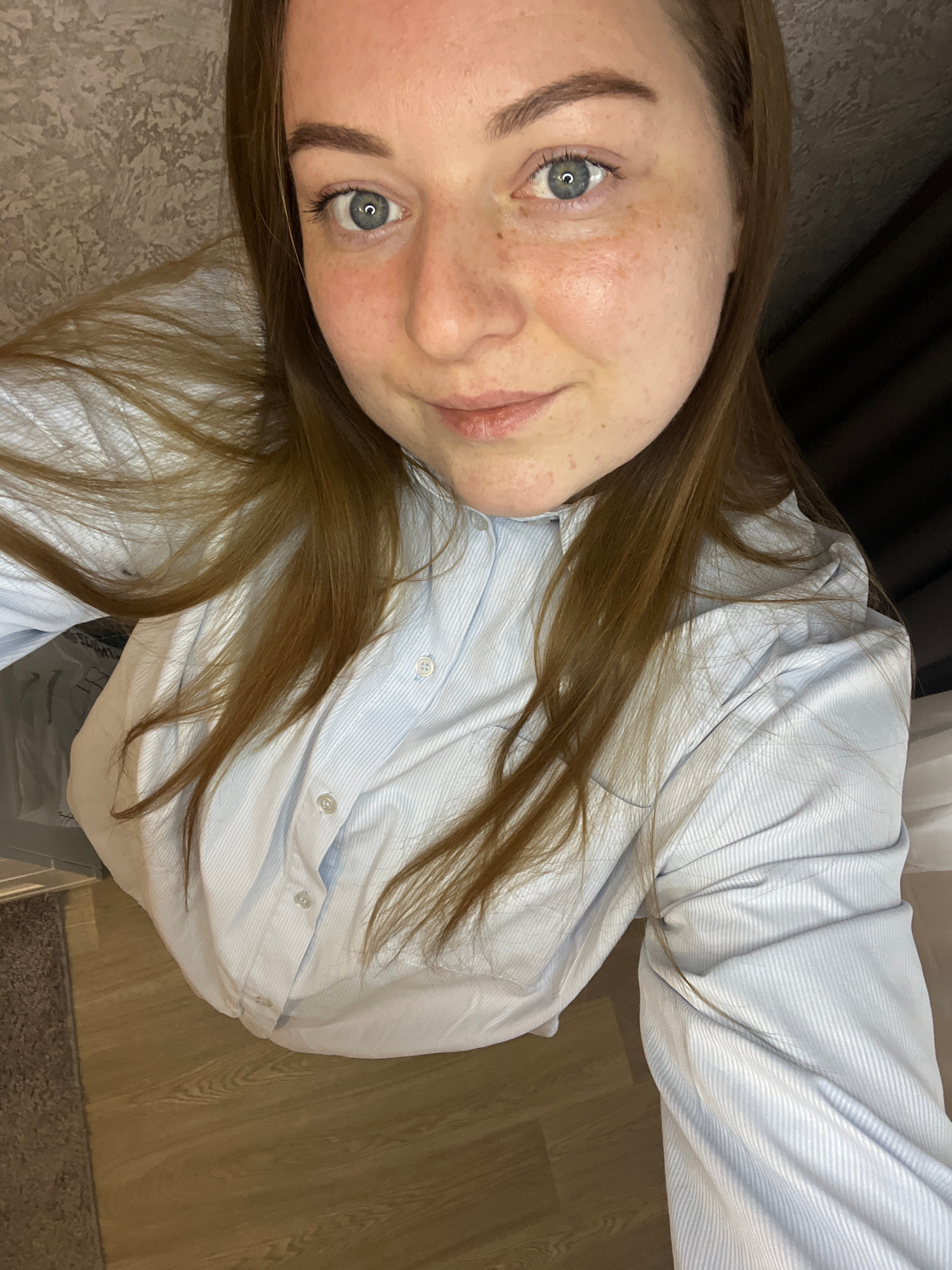A young woman with light brown hair and fair skin is centered in the image, smiling slightly. Her light blue eyes are visible. She is wearing a light blue striped button-down shirt. The background inc…read more