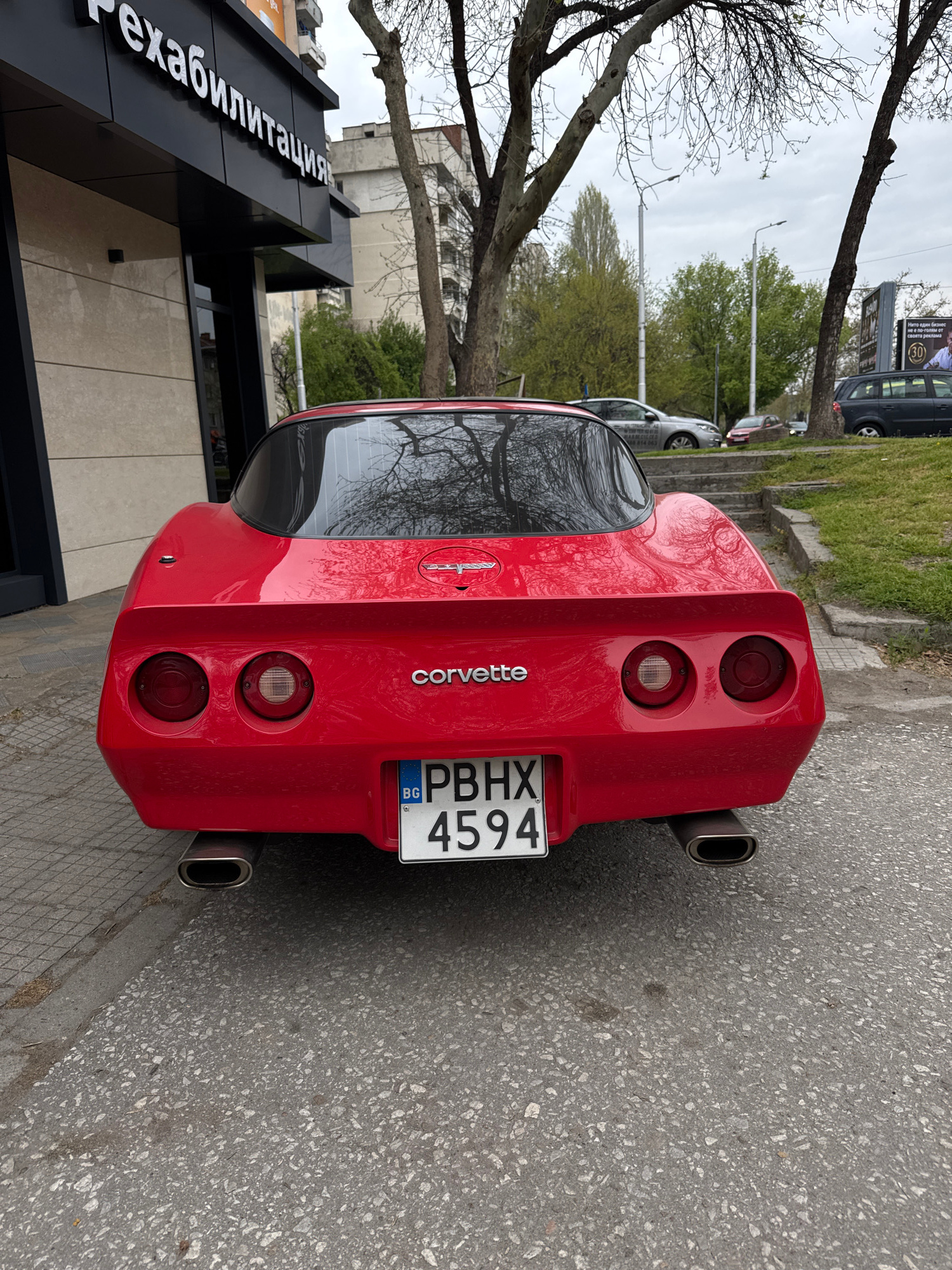 The image shows the rear of a red Corvette C4, parked on the street in Plovdiv, Bulgaria. The license plate reads "PBHX 4594." The building "Рехабилитация" is visible on the left. The background inclu…read more