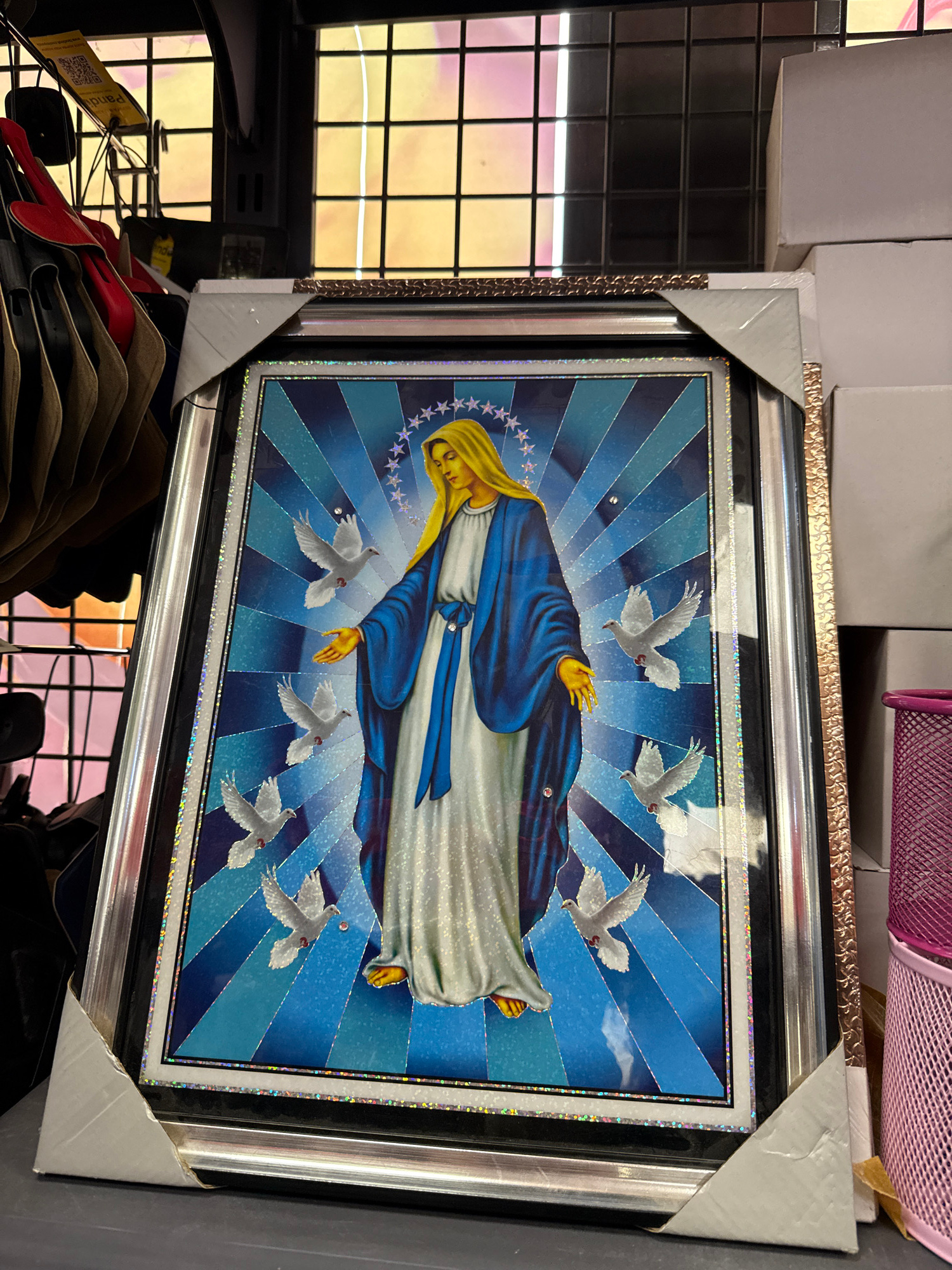A framed print of the Virgin Mary surrounded by white doves hangs on a metal rack, likely for sale, in an indoor setting. The image features the Virgin Mary in a blue and white robe with a circle of s…read more