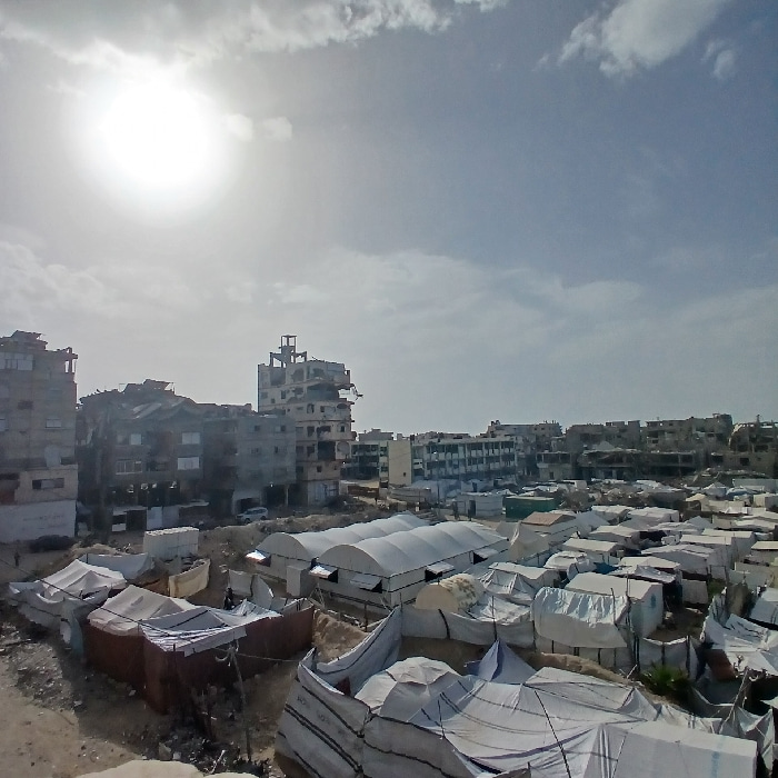 This image captures a panoramic view of an urban area in Gaza City, Palestinian Territory. The scene is dominated by a sprawling, dense encampment of temporary shelters in the foreground and mid-groun…read more