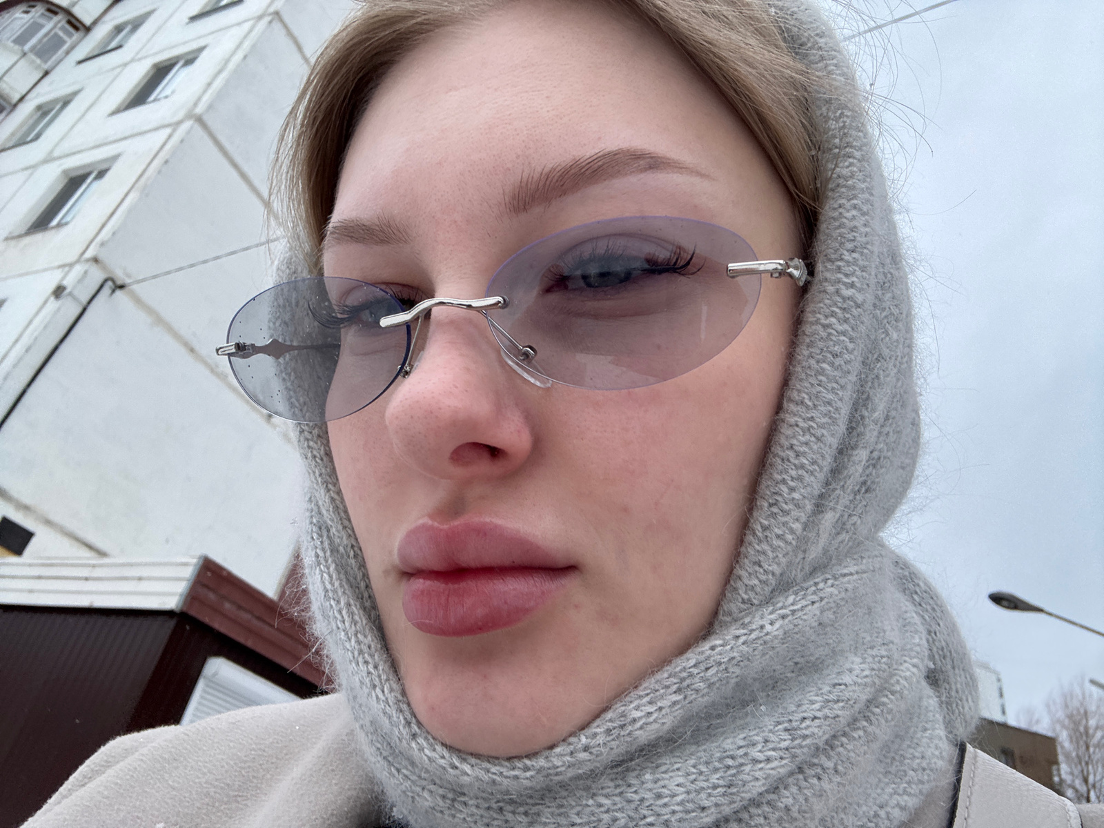 An upward-angled, inverted close-up shot focuses on a person's face against an outdoor urban backdrop, identified as Perm, Russia. The subject, likely female, has light-colored hair partially covered…read more