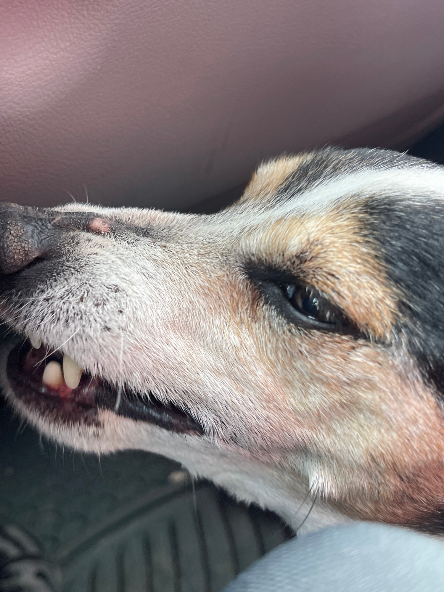 The image is a close-up of a dog's face. The dog has light-colored fur with patches of black and brown. Its eye is open and focused, and its mouth is slightly open, revealing some teeth. The backgroun…read more