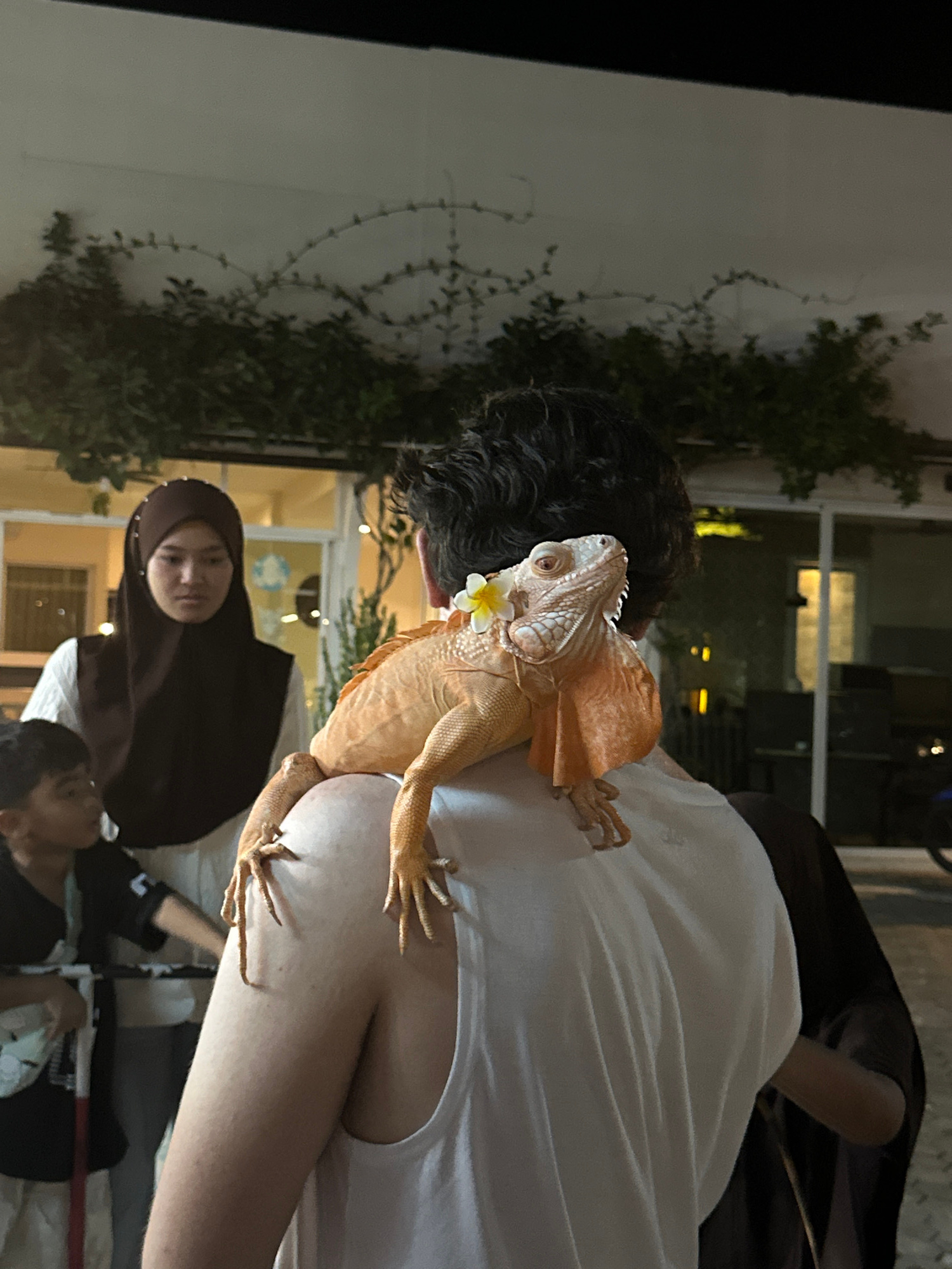 An orange albino iguana, adorned with a white frangipani flower behind its head, is perched on the right shoulder of a person wearing a white tank top, viewed from behind. The iguana faces right, disp…read more