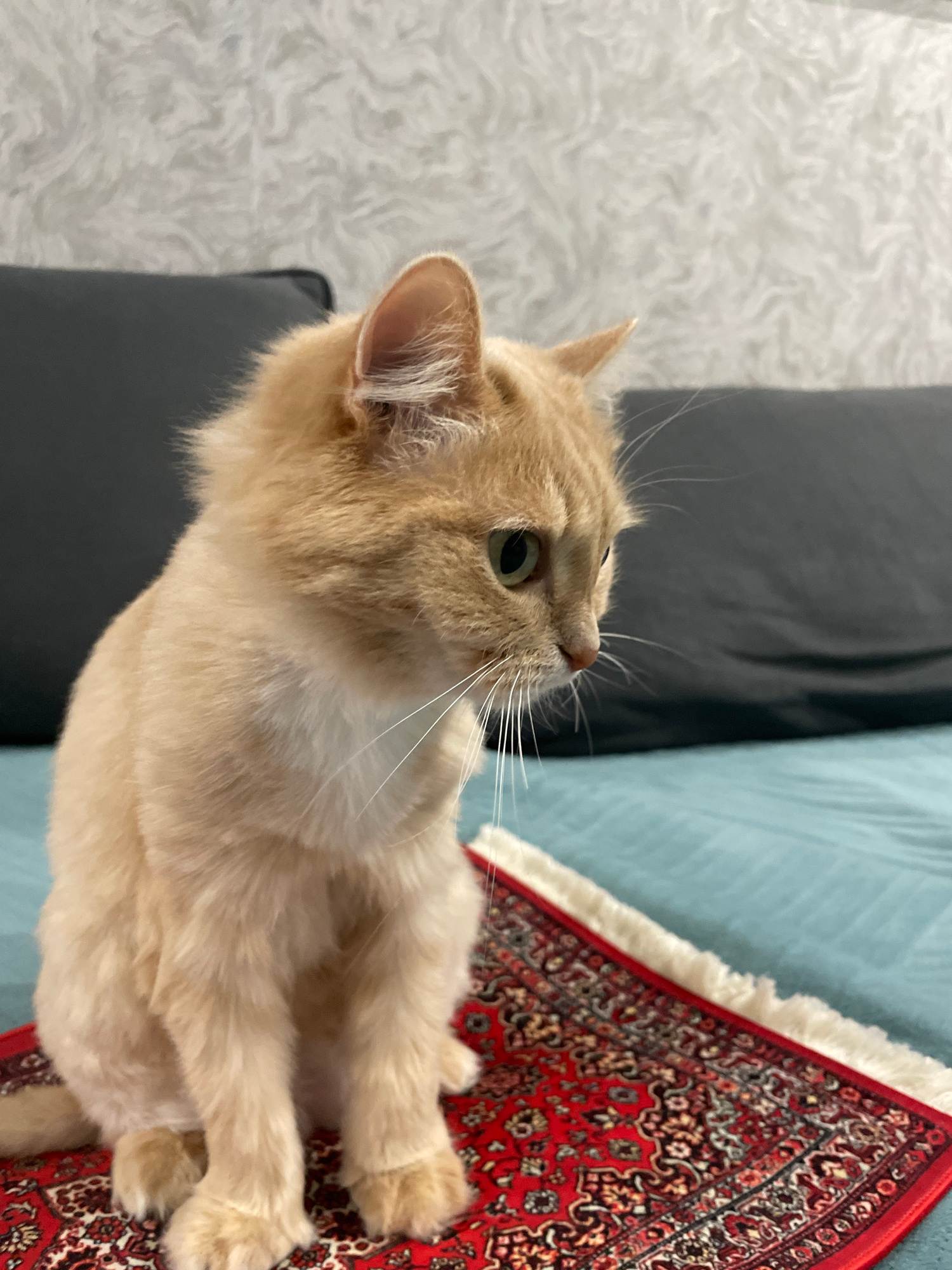An orange cat is sitting on a colorful rug. The cat is looking up and to the right. The background consists of a white furry surface, a dark gray surface, and a blue surface. The location is unspecifi…read more