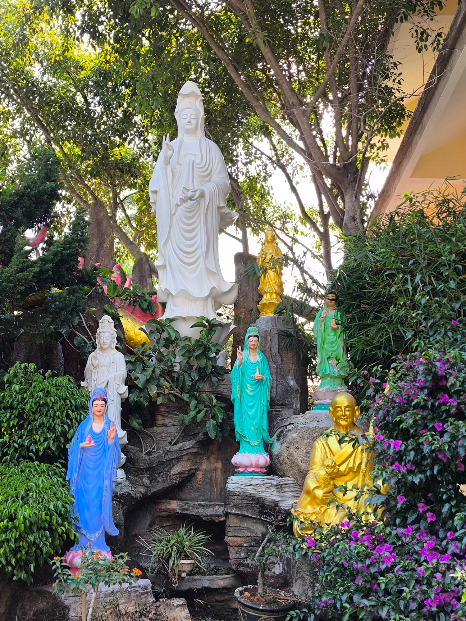 The photo shows a garden area in Lâm Viên - Đà Lạt, Vietnam with a series of statues. The statues include a large white statue that stands tall in the center, a gold statue, green statue, blue statue,…read more