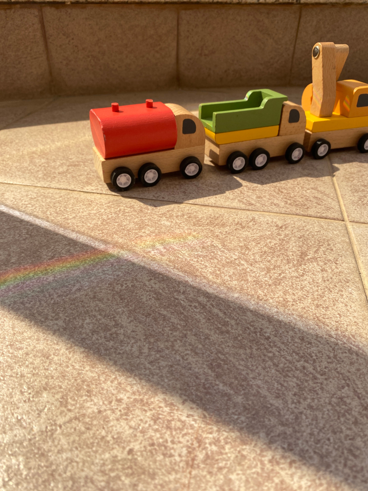 A line of three colorful wooden toy vehicles rests on a light-colored, textured tiled surface in Boreti, Montenegro. The toys are connected, forming a small train or convoy. The foremost toy is a yell…read more