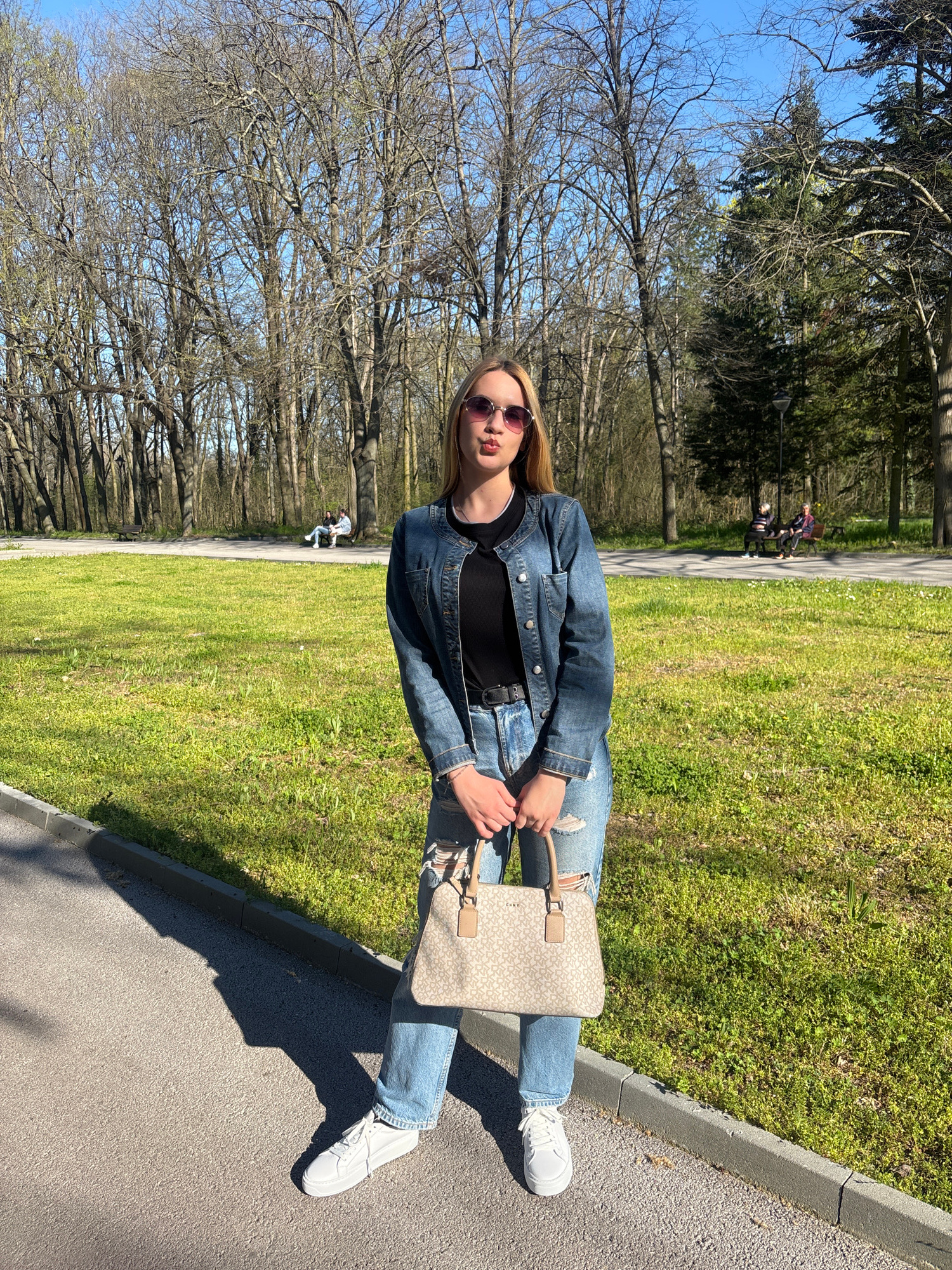 A fair-skinned woman stands on a paved pathway bordered by grass and trees, possibly in a park in Dimitrovgrad, Bulgaria. She is wearing a black top, denim jacket, light blue jeans with a rip at the k…read more
