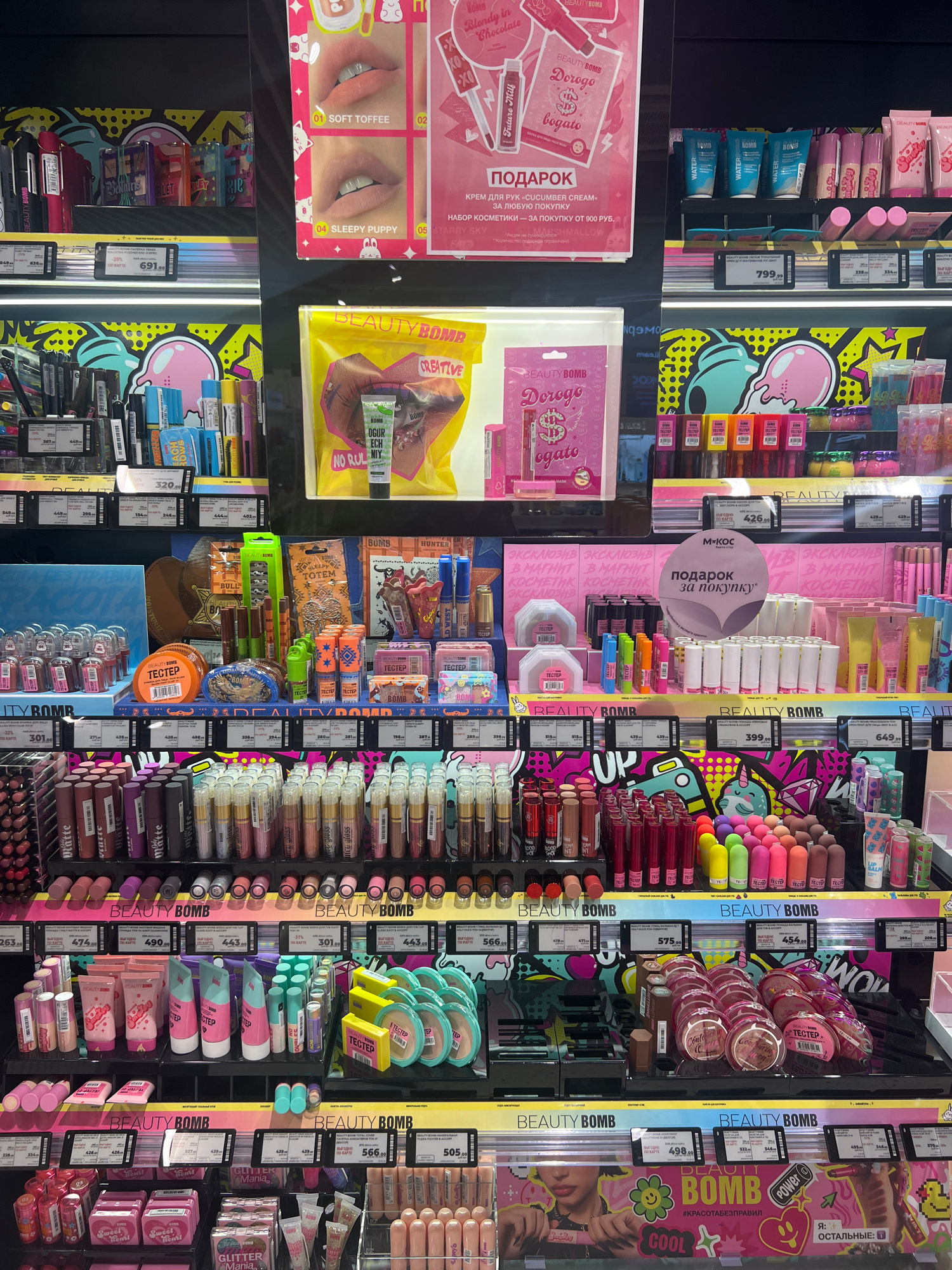 The image shows a well-stocked display of "Beauty Bomb" cosmetic products in what appears to be a retail setting. The scene features various shelves filled with makeup items like lip gloss, lipsticks,…read more