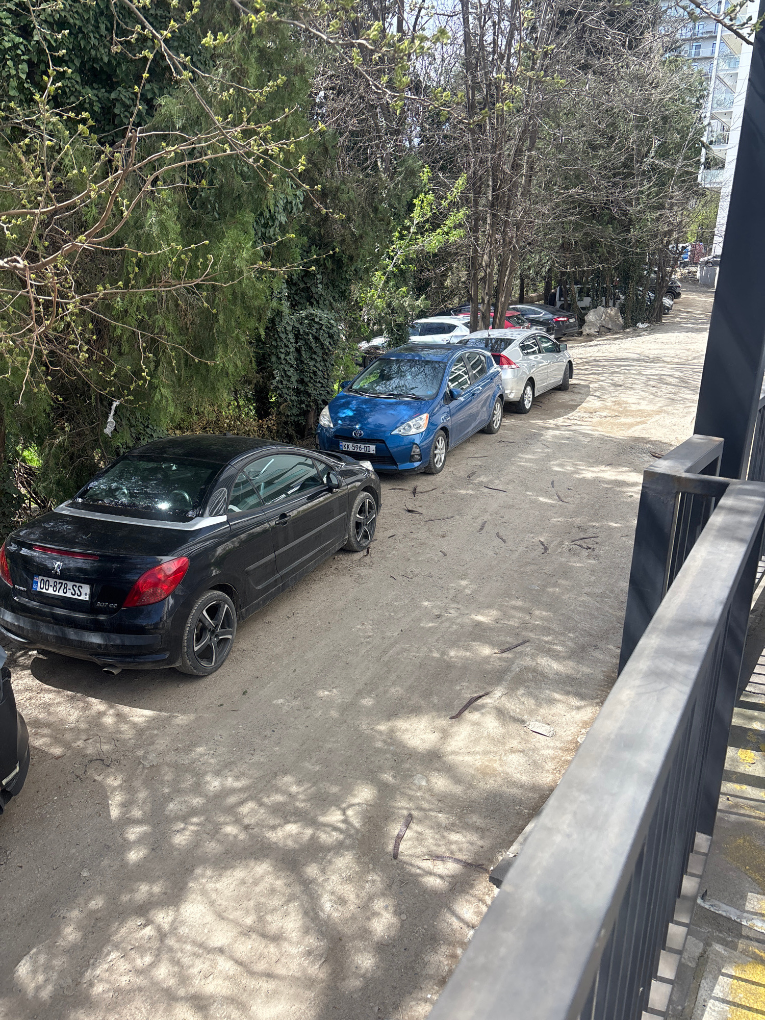 A street in Tbilisi, Georgia, shows a row of parked cars under trees. A black Peugeot 207 CC is parked closest to the camera, with a visible license plate "GG-878-SS." Further along, a blue car with a…read more