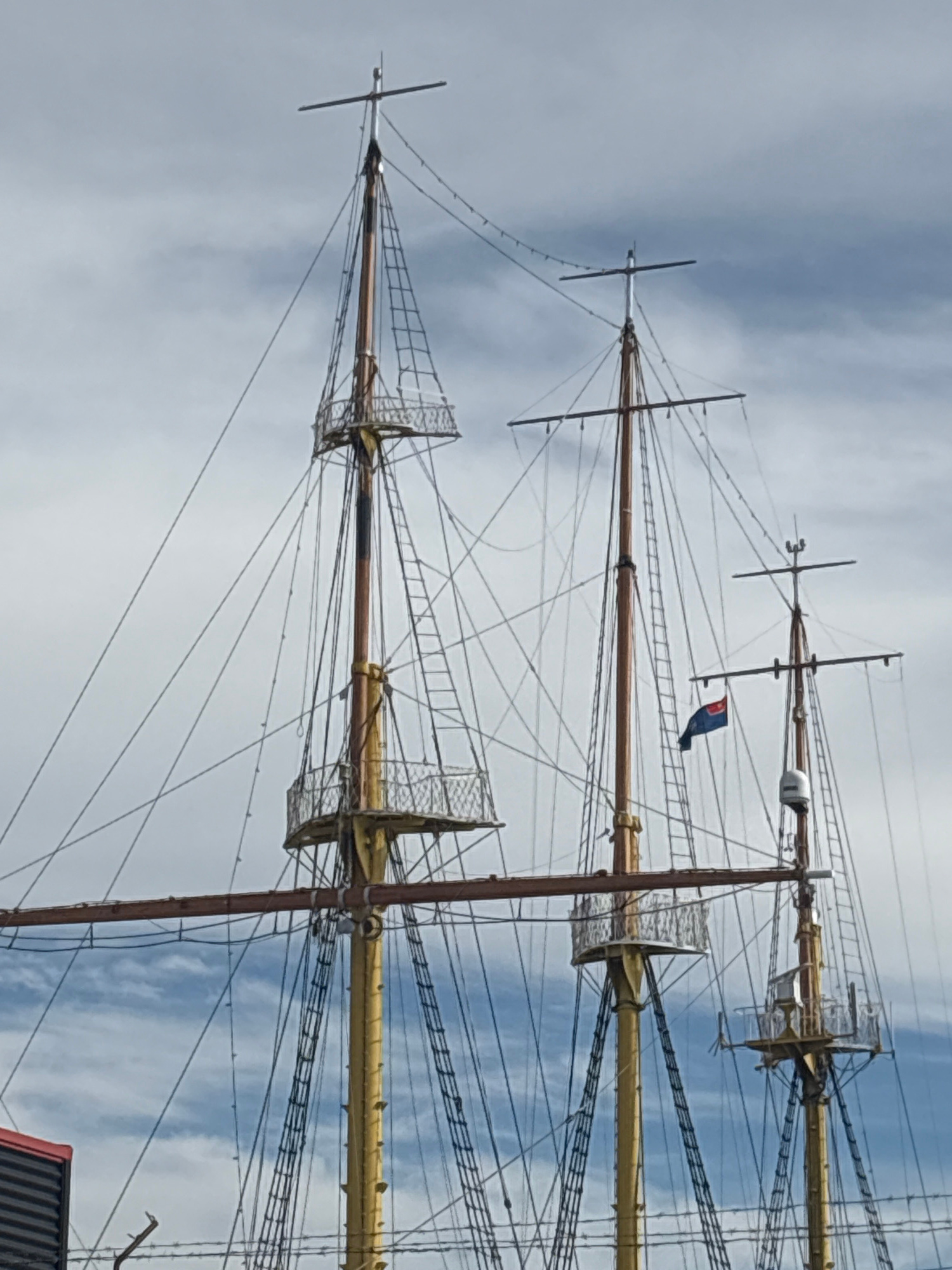 The image shows the masts and rigging of a tall ship. The masts are tall and taper toward the top, with horizontal yards extending from them. Complex network of ropes and lines, known as rigging, conn…read more