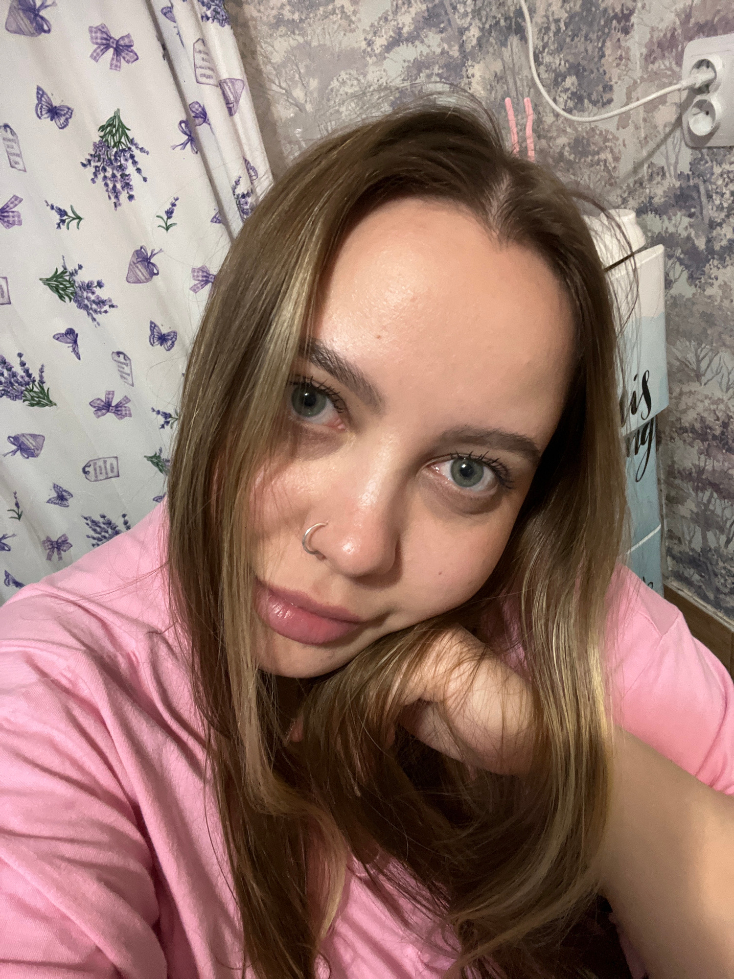 The original image displays a portrait-oriented selfie of a young woman taken indoors, likely in a bedroom in Novopokrovskaya, Russia. The woman, who appears to be in her late teens or early twenties,…read more