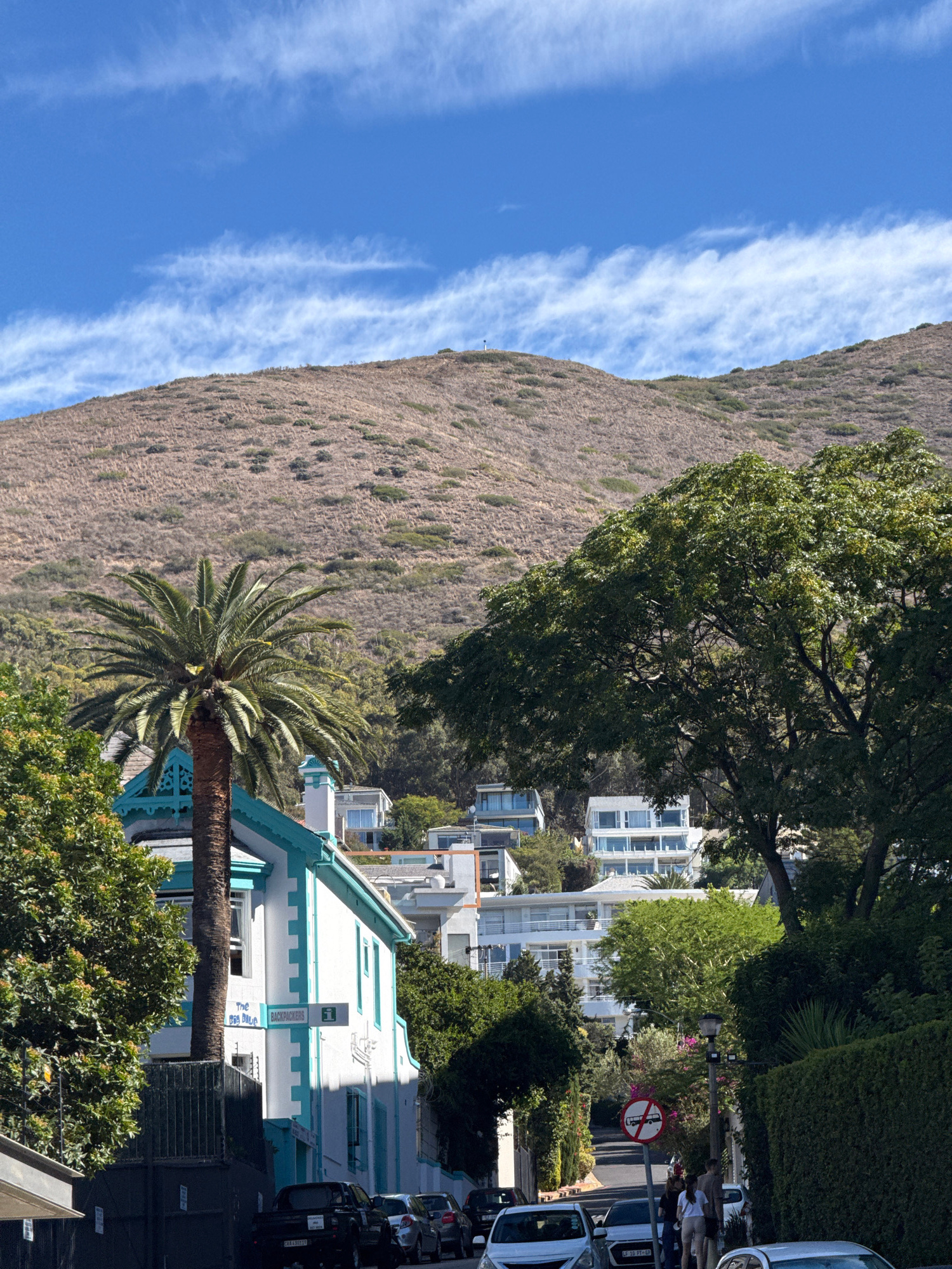 The image presents a residential street view on a sunny day in Green Point, Cape Town, South Africa, with a prominent, dry mountain forming the backdrop. The sky is clear blue, featuring several elong…read more