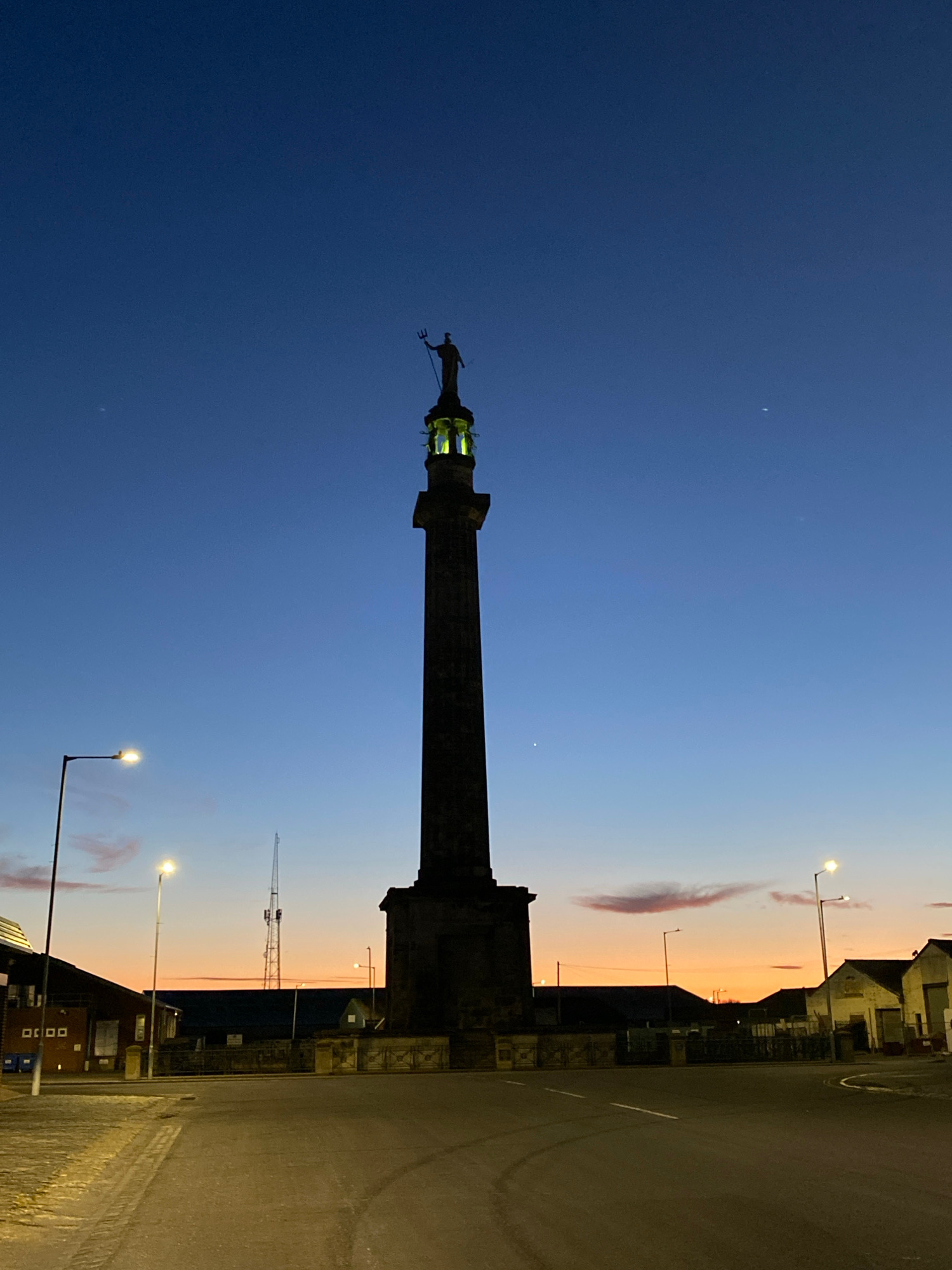 The photograph captures the Nelson Monument in Gorleston-on-Sea, United Kingdom, at dusk. The monument, a tall stone column topped with a statue of Britannia holding a trident, dominates the scene aga…read more