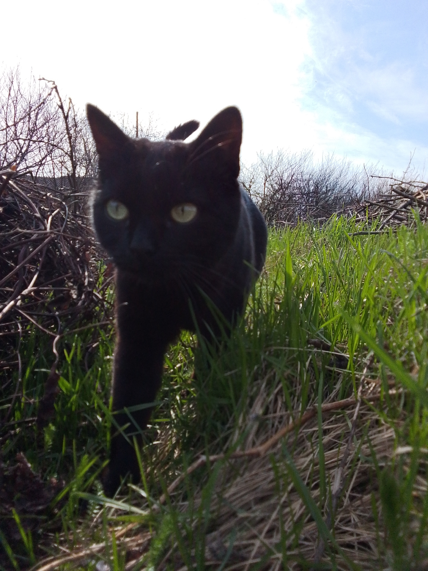 A low-angle outdoor photograph captures a sleek black cat with piercing bright green eyes walking directly towards the viewer. The cat is the prominent subject, positioned close to the camera, its hea…read more