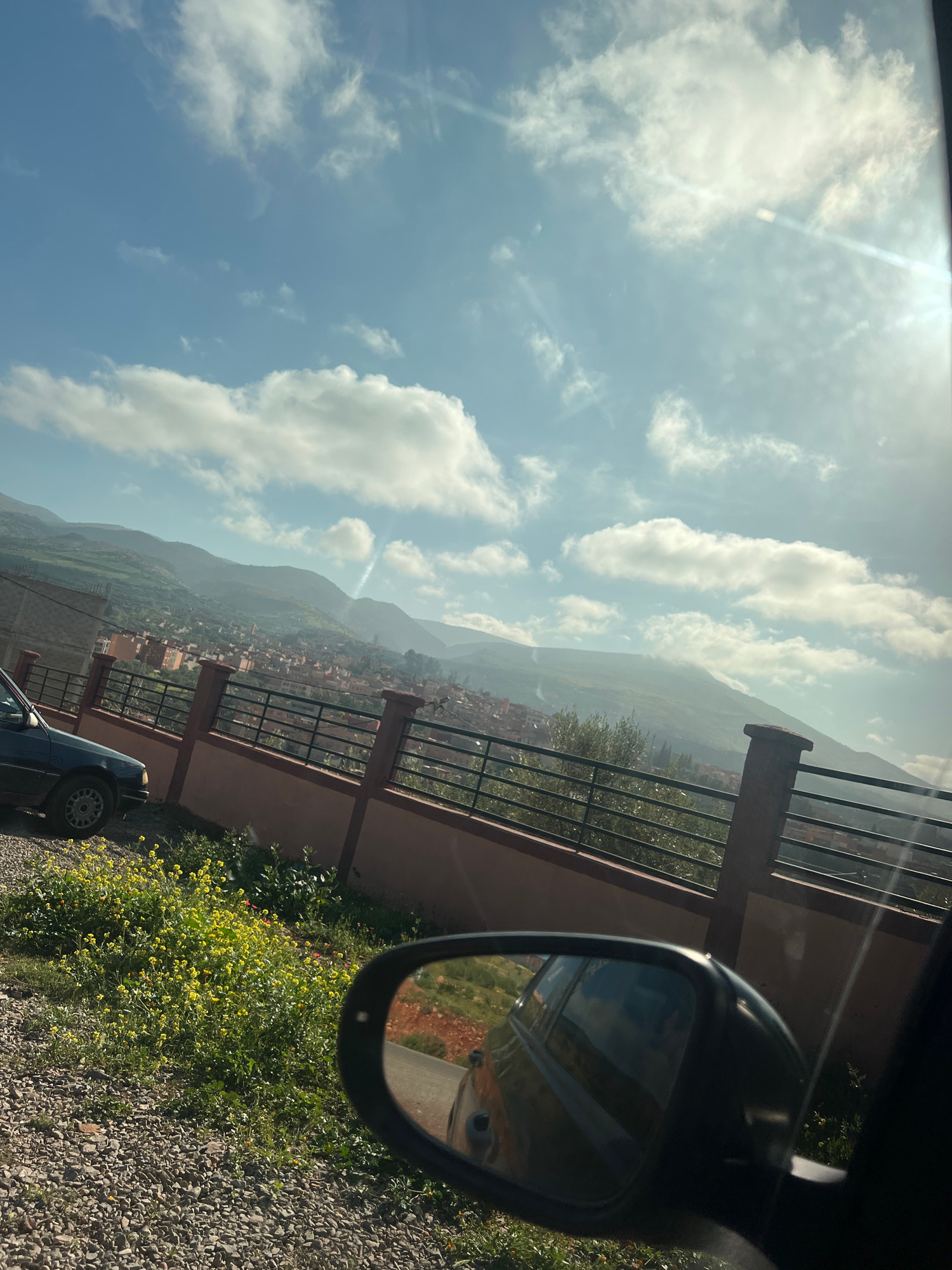 The image depicts a landscape viewed from inside a vehicle, possibly near the city of Ouaouizert, Morocco, given the hilly terrain and building styles. The sky is visible, with patchy clouds and brigh…read more