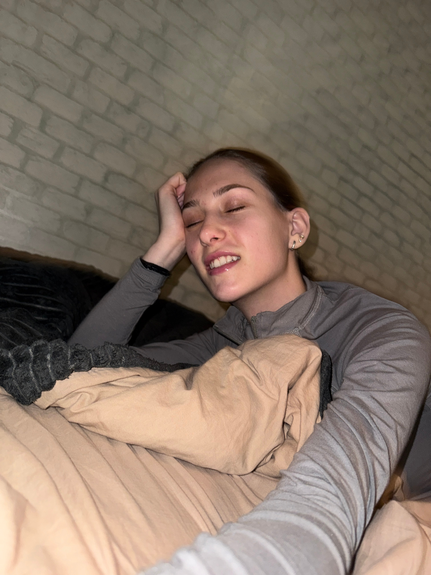 A young woman with fair skin and brown hair is lying on a bed, partially covered by beige and grey blankets. She is wearing a grey long-sleeved shirt. Her head rests on her left hand, and she appears…read more