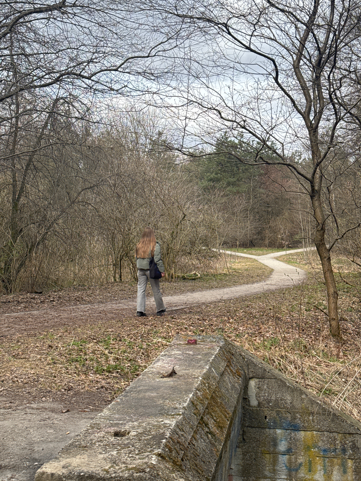 A person with long hair is walking on a path. The path is dirt and leaves, and is surrounded by trees and bushes. The path leads to a fork in the distance. To the right of the path is a concrete wall.…read more