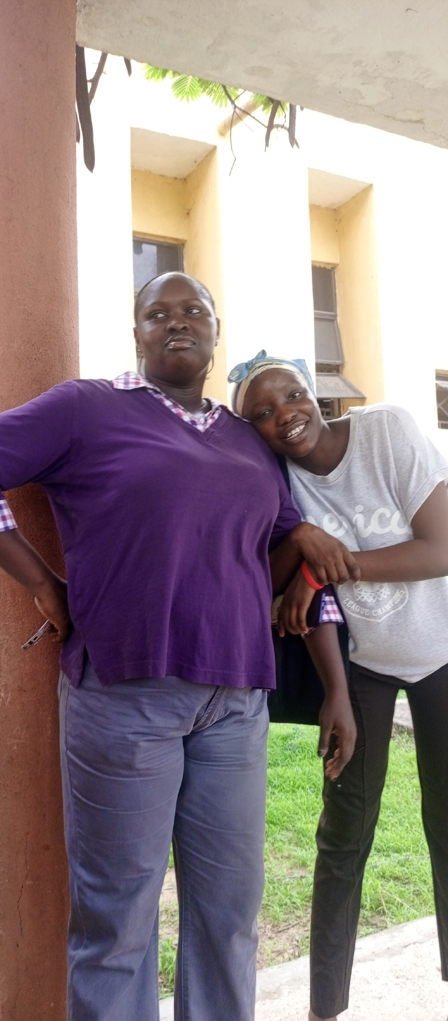Two African women pose for a photograph in Keffi, Nigeria. The woman on the left wears a purple V-neck t-shirt over a plaid collared shirt, paired with grayish-blue pants. She stands next to a reddish…read more