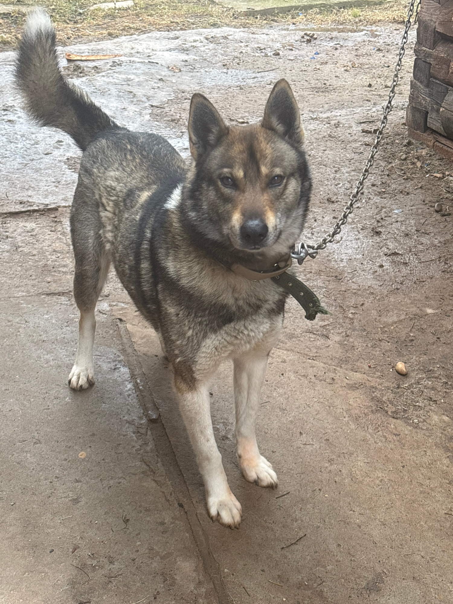 A medium-sized dog with grey and tan fur, a black stripe down its back, and white paws is standing on a concrete surface. It has a grey and black collar with a green strap and is attached to a metal c…read more