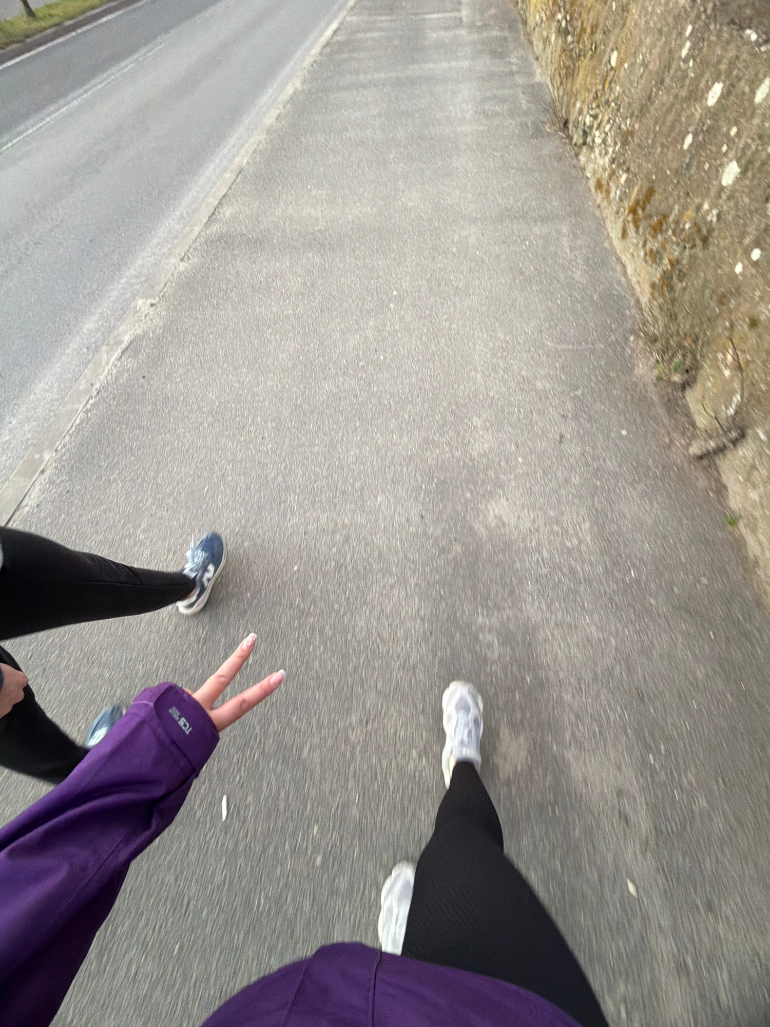 The image shows a paved area, possibly a sidewalk or road, with two people walking. One person is wearing black leggings and white sneakers and part of a purple jacket is visible. The other person is…read more