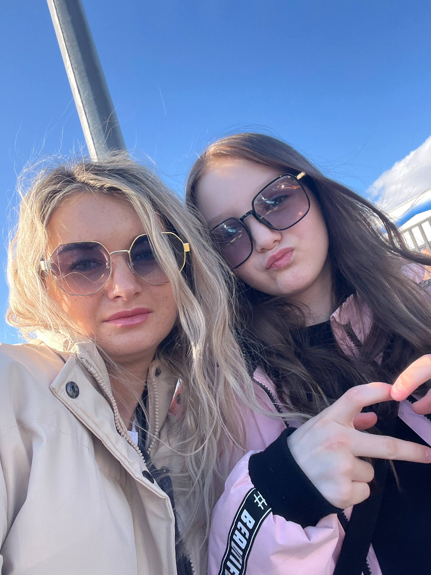 Two women are positioned close together, taking a selfie from a low angle, with the sky visible in the background. The woman on top has long brown hair, wears dark-framed glasses, and is wearing a pi…read more