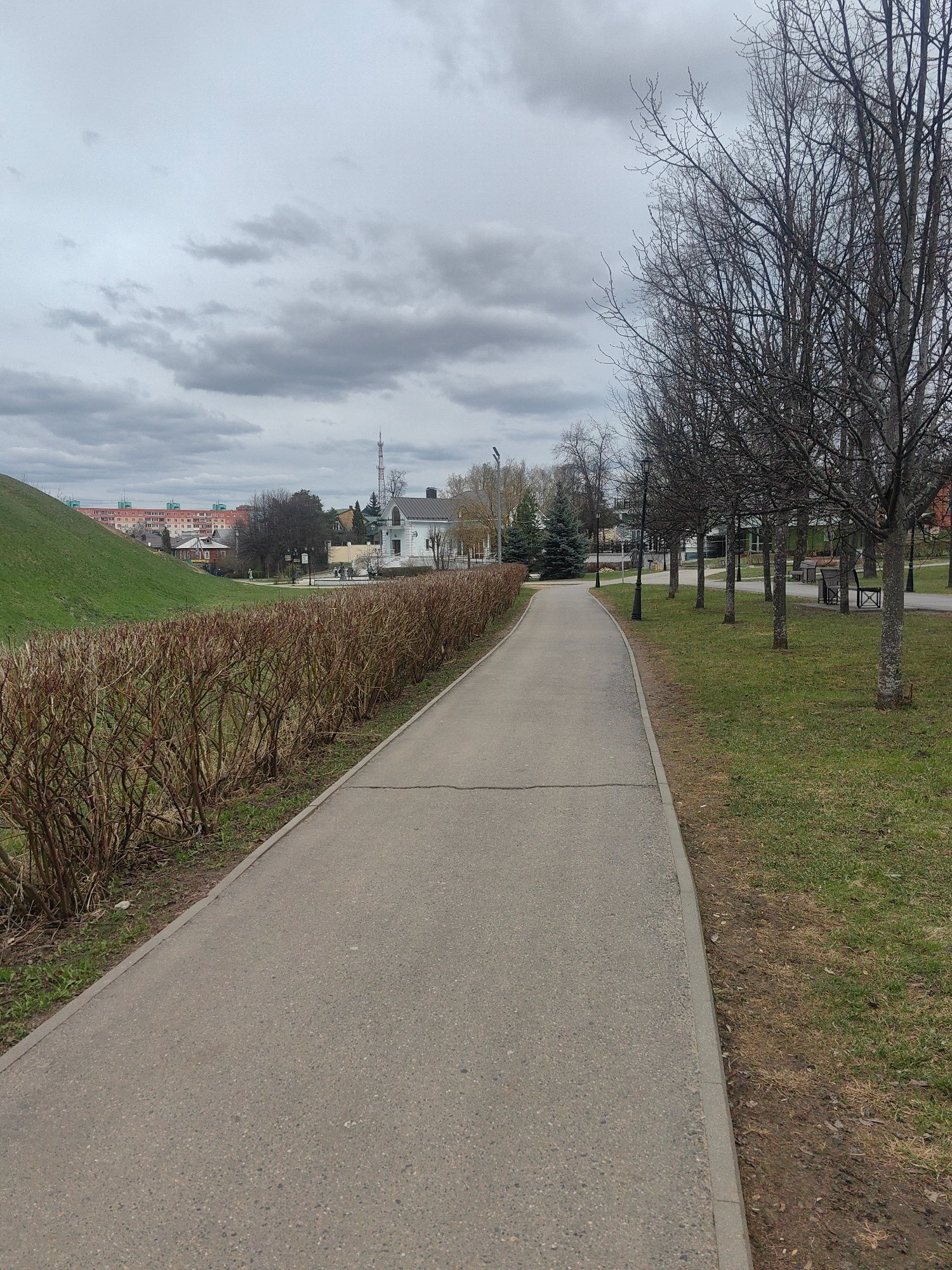 This image captures a paved park pathway in Dmitrov, Russia, on an overcast day, likely during early spring. The sky is a uniform grey, covered in thick clouds, with no direct sunlight. The main subj…read more