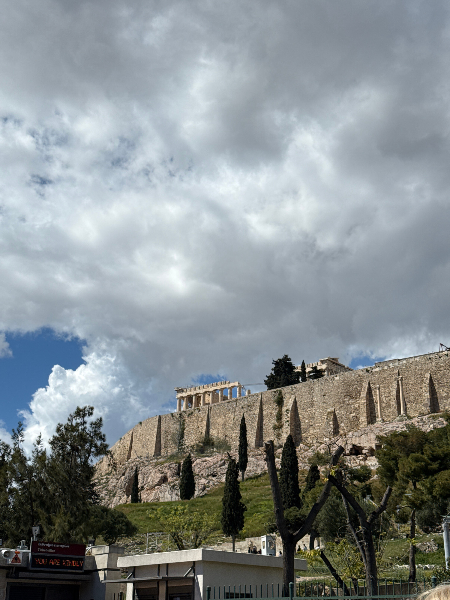Captured from a slightly low angle, the image features the towering Acropolis of Athens against a sky dominated by thick, overcast clouds. The stone walls of the Acropolis, partially obscured by veget…read more