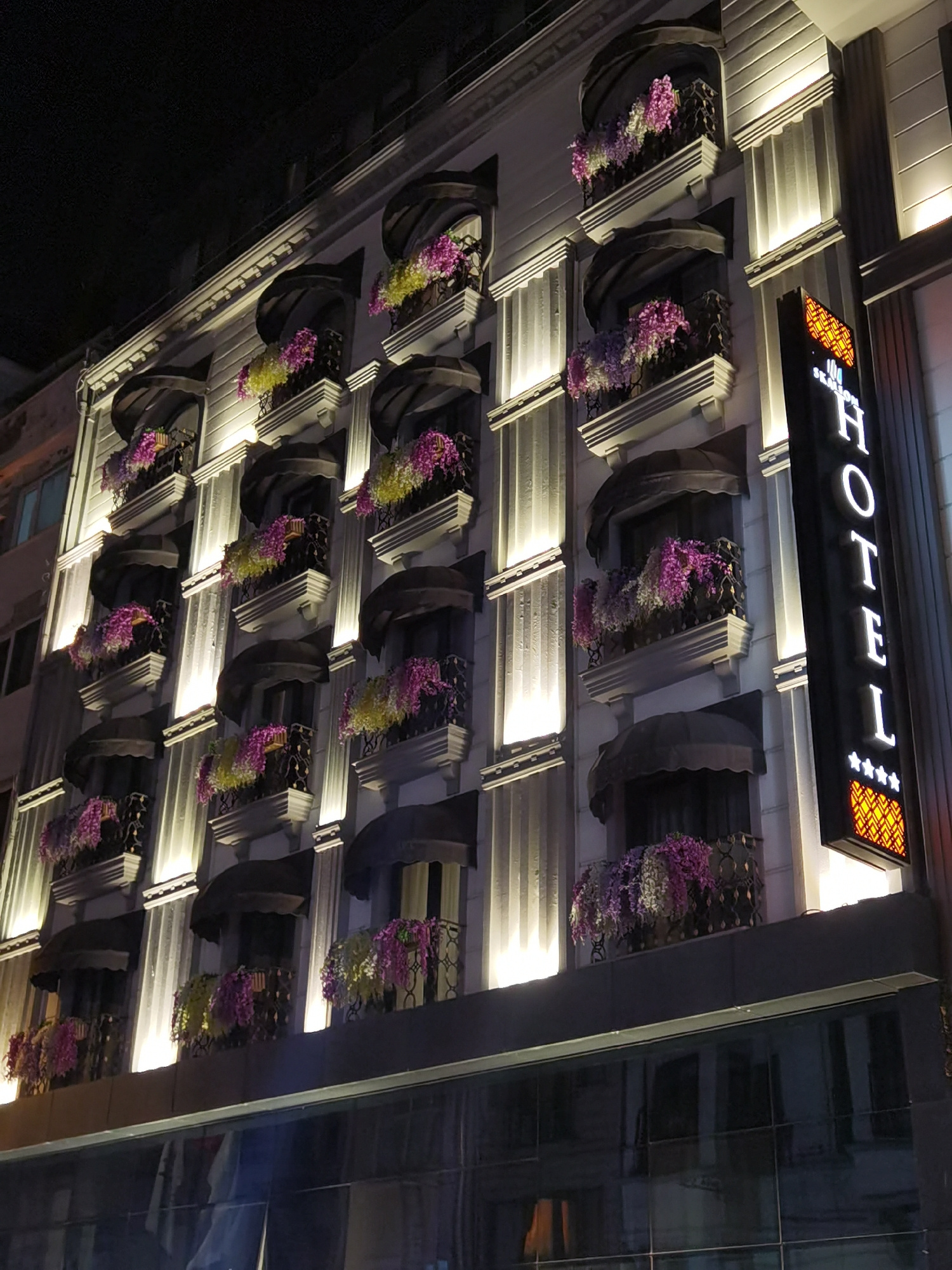 A low-angle, nighttime, eye-level shot shows the facade of a tall, well-lit hotel in Istanbul, Turkey. The hotel, possibly named "JM Plaza Hotel", features multiple floors, each with a balcony. The ba…read more