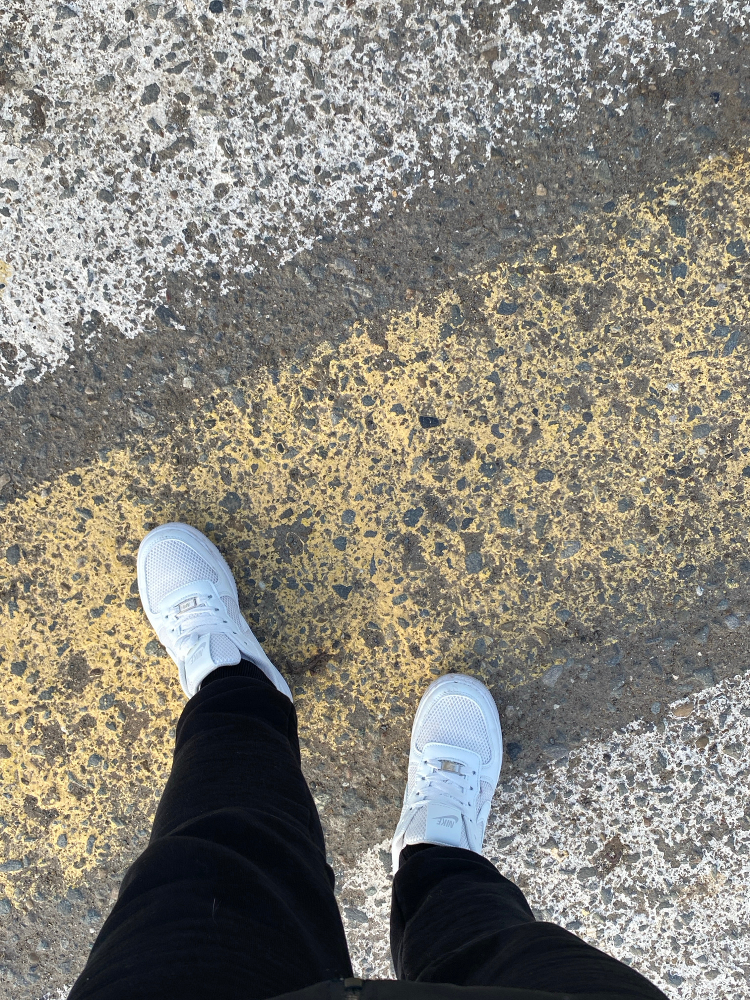 An overhead shot captures the lower legs and feet of a person standing on an asphalt surface. The individual is wearing black trousers and white sneakers. The right sneaker clearly displays the "NIKE"…read more