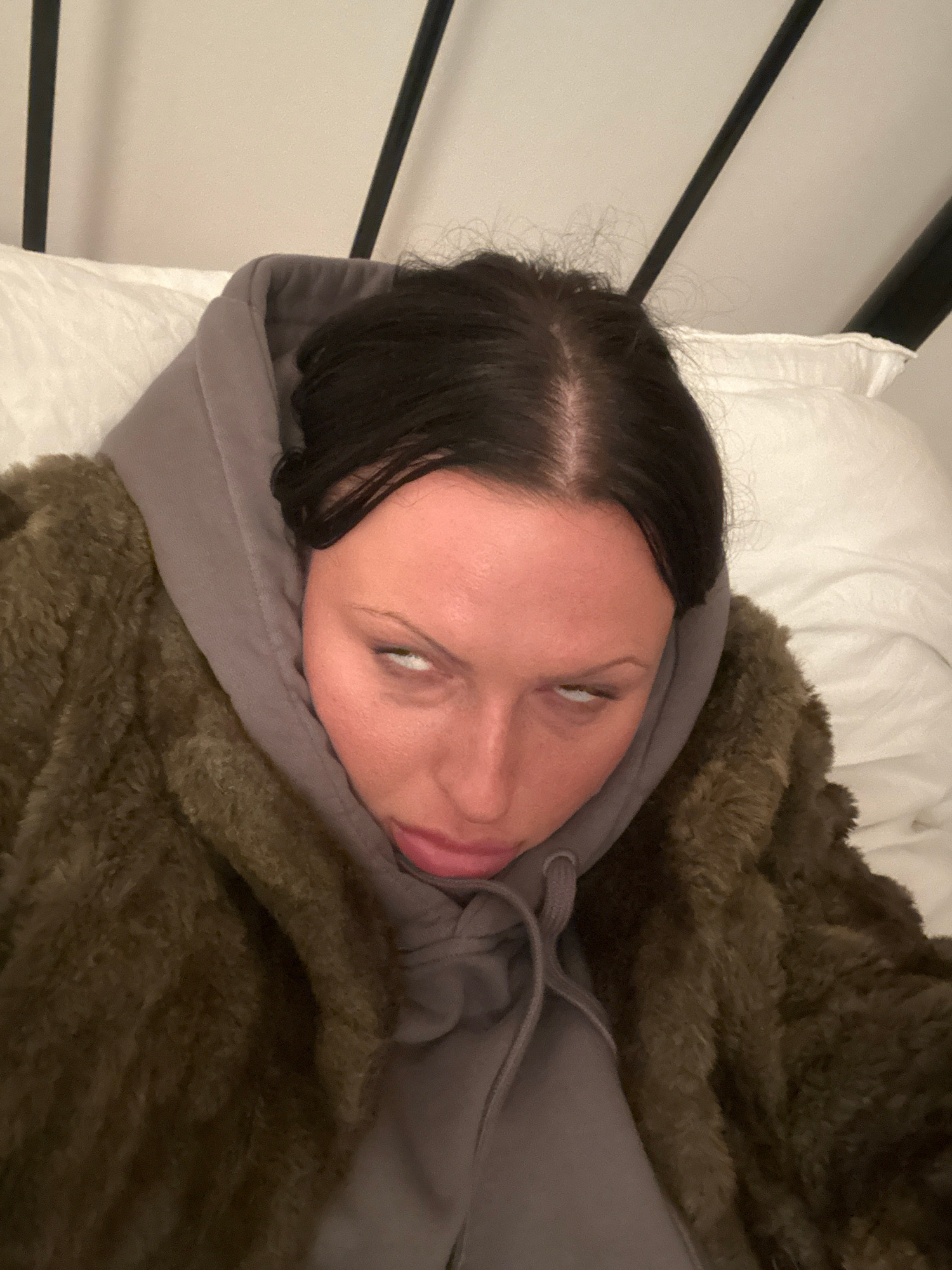 A female individual is depicted in a close-up, high-angle shot, resting on white bedding, likely within a bedroom in Tunbridge Wells, United Kingdom. The subject, with dark hair parted centrally, exhi…read more