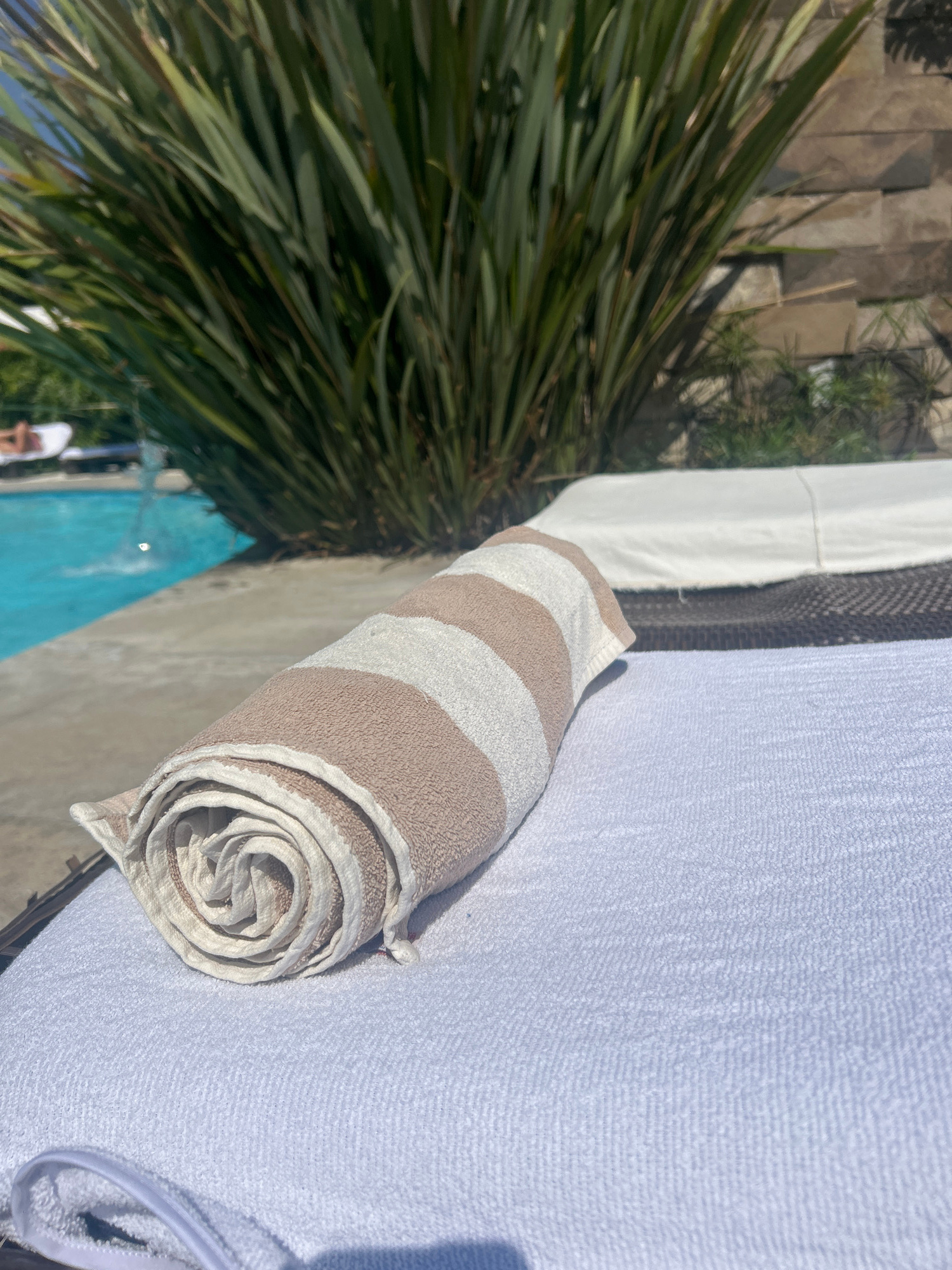 Here is a forensic description of the image: **Location:** Atlixco, Mexico **Scene:** A sunlit outdoor setting, likely a poolside area. **Objects:** * A rolled-up towel with alternating beige and…read more