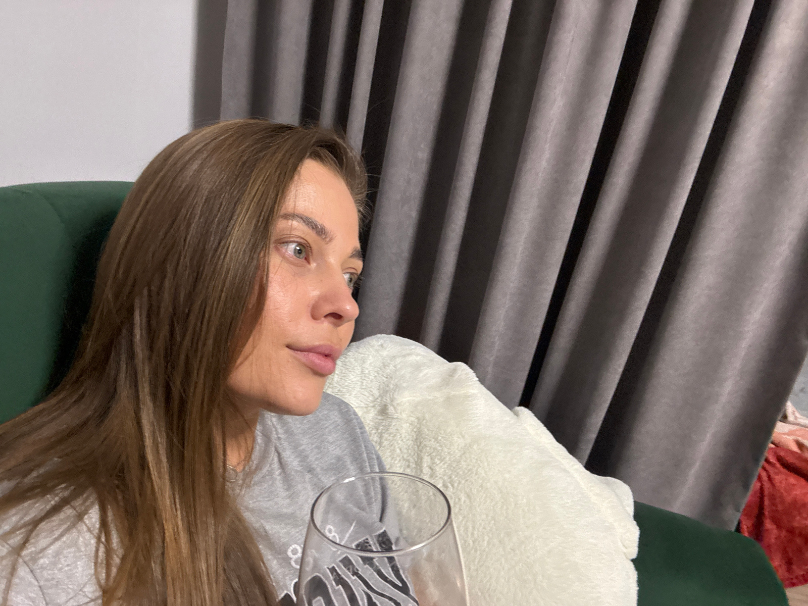 A woman with shoulder-length brown hair and light eyes is holding a clear glass. She is wearing a gray t-shirt and resting against a fluffy white pillow and a green cushion. Behind her is a gray curta…read more