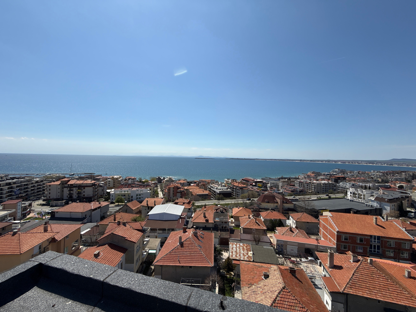 The image presents a high-angle view of Sveti Vlas, Bulgaria, looking towards the Black Sea on a clear day. In the foreground are residential buildings with terracotta tiled roofs. A mix of older hous…read more