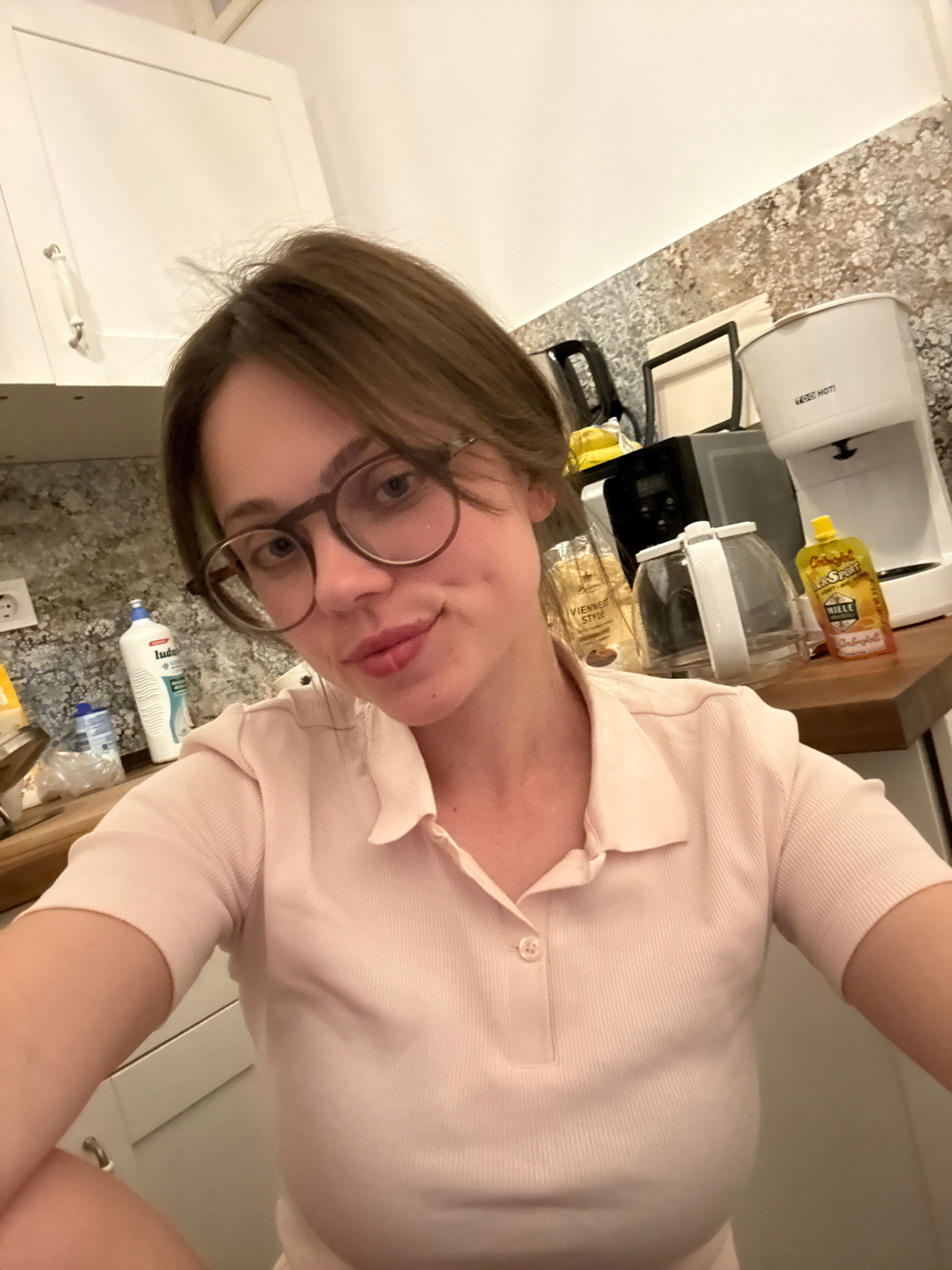 A young woman with shoulder-length brown hair and round glasses is captured in a close-up selfie, taken from a slightly low angle. She wears a light pink short-sleeved polo shirt and has a subtle, pla…read more