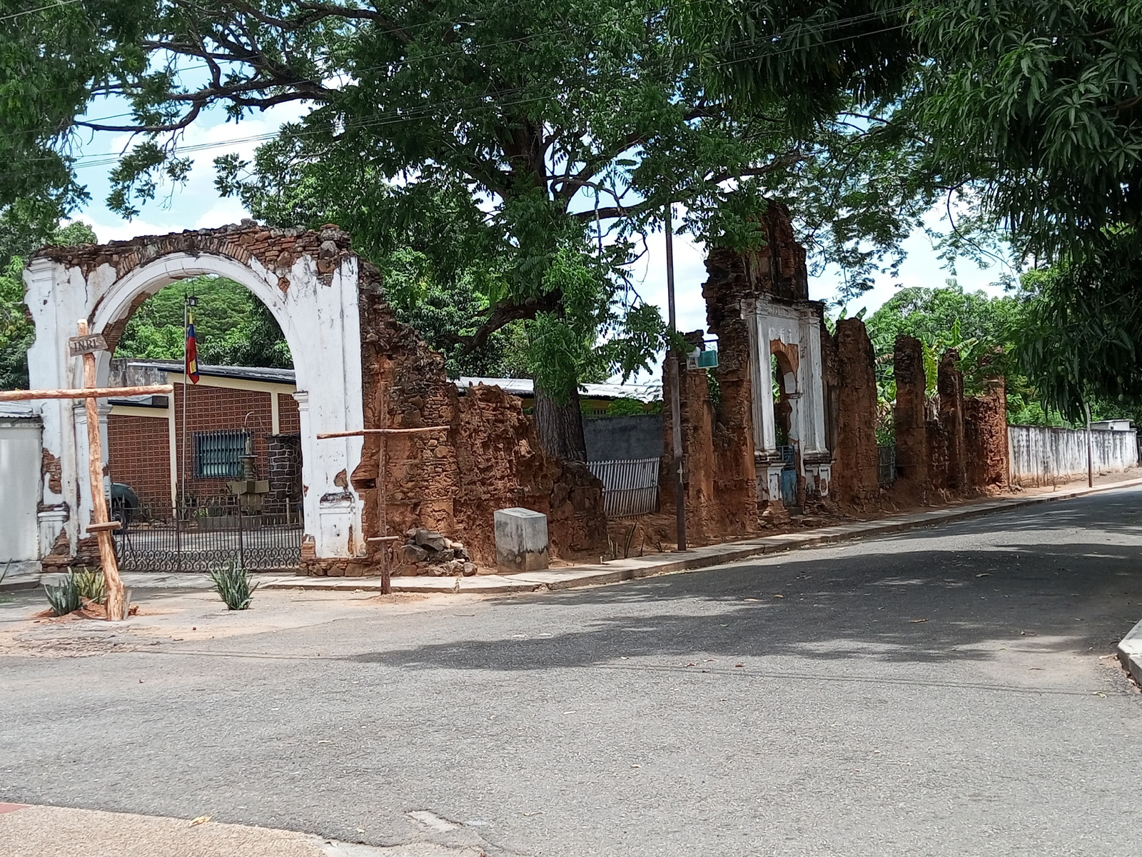 The image depicts a deteriorated historical site in El Pao, Venezuela. A partially ruined brick and white plaster archway stands at the corner, with a Venezuelan flag visible through the arch. Adjacen…read more