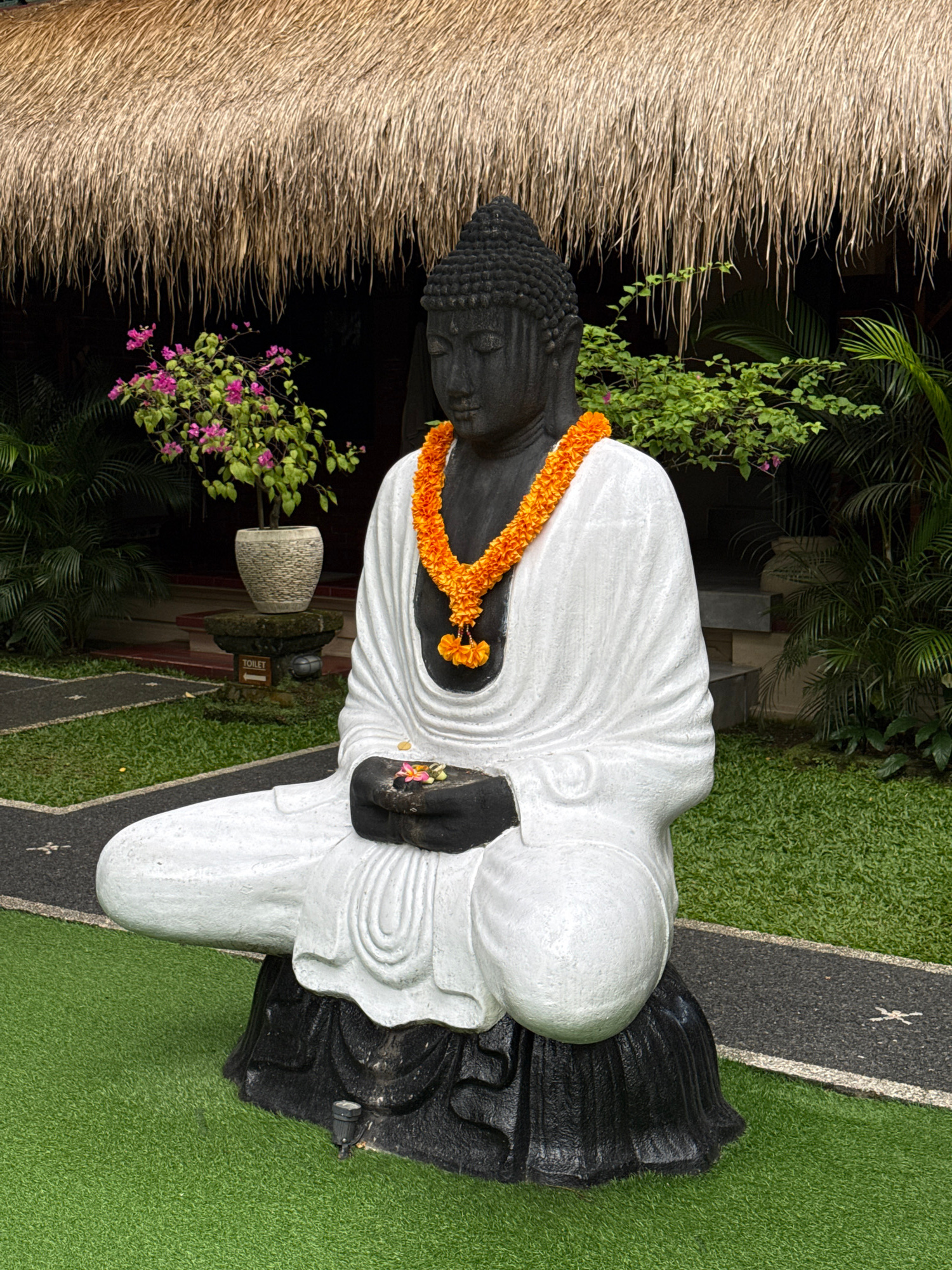 This media file captures a serene outdoor setting featuring a large reclining Buddha statue. The statue is prominently displayed, with its head and hands made of a dark, textured material, possibly st…read more