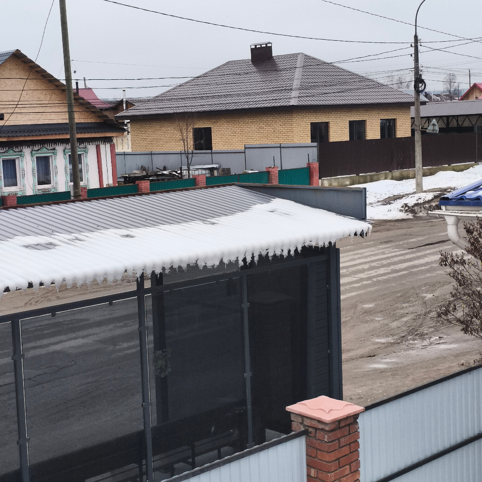 The image shows a residential street in Chaikovsky, Russia on an overcast day. The foreground features a corrugated metal roof partially covered in snow with icicles. Behind it is a dark, enclosed str…read more