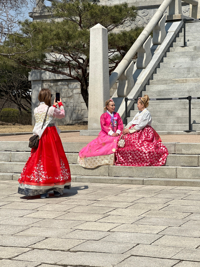 Three female subjects are depicted outdoors at the National Palace Museum of Korea, situated within the Gyeongbokgung Palace grounds in Jongno-gu, Seoul, South Korea. The scene is set against a large,…read more
