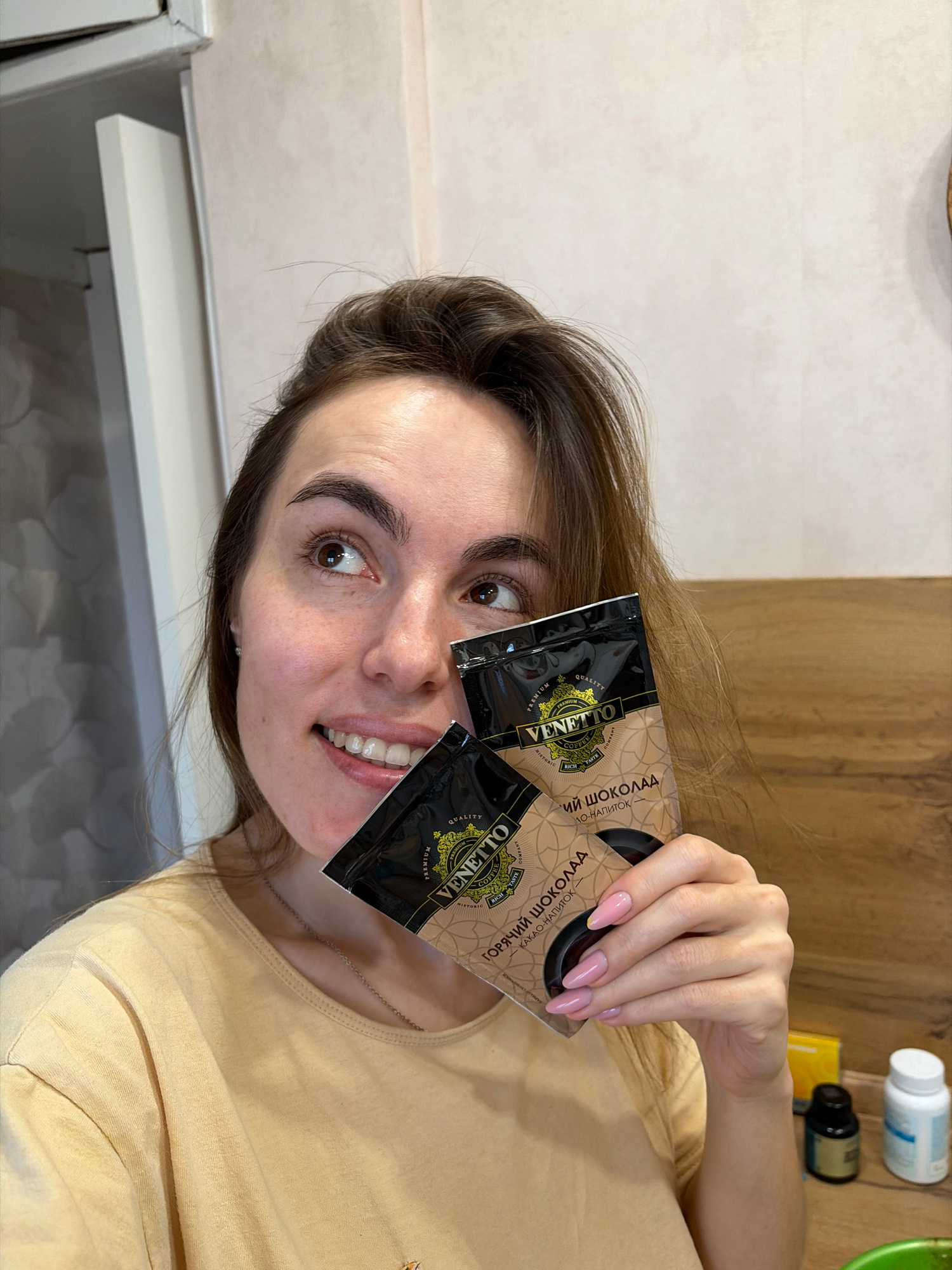 A woman in a light yellow T-shirt is holding two black packets of "VENETTO" hot chocolate mix close to her face, partially obscuring her left eye and cheek. The packets are labeled in Cyrillic script…read more