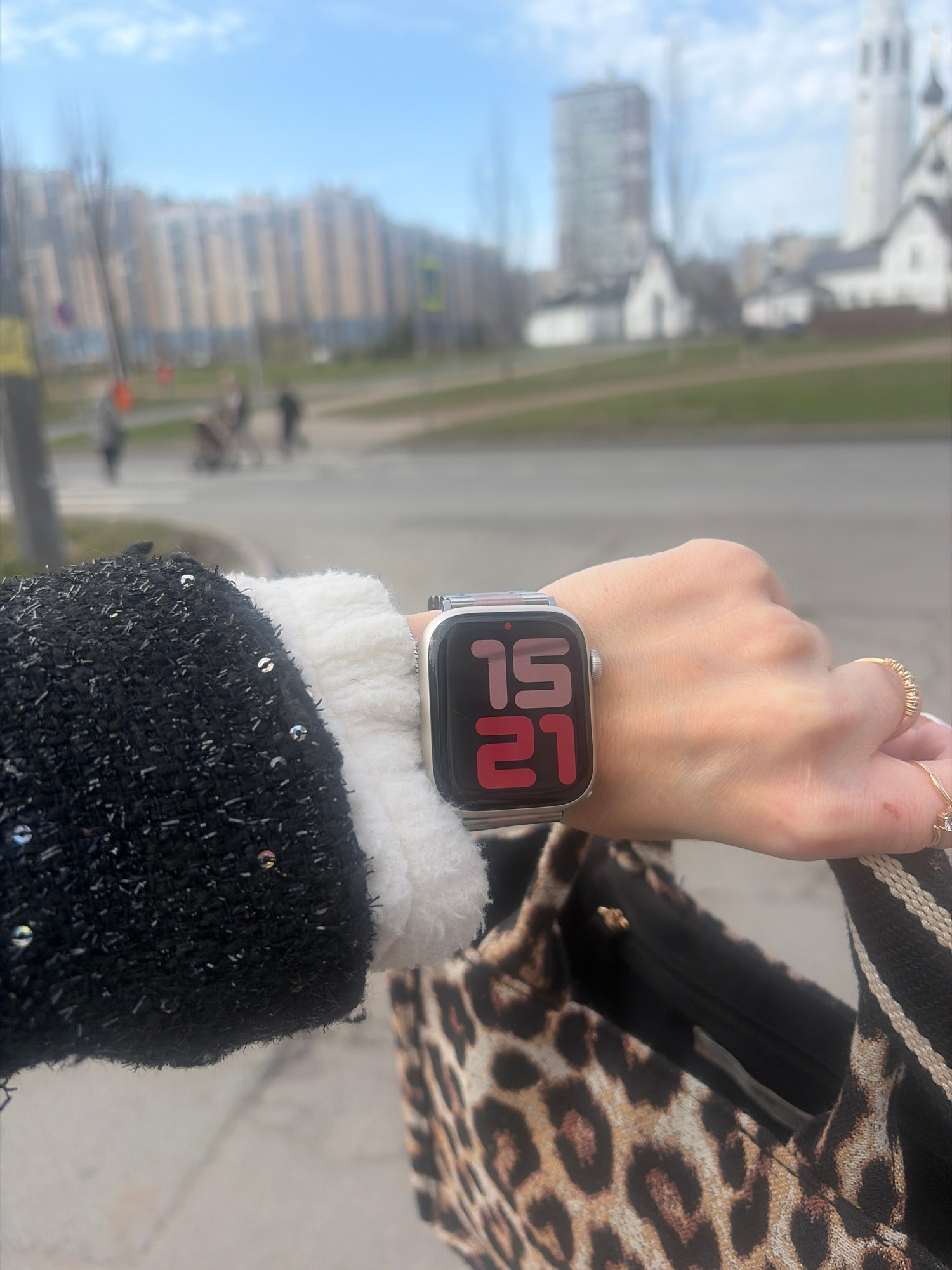 The image captures a close-up, vertical shot of a person's right arm, hand, and wrist, revealing an urban outdoor setting in the blurred background. The primary subject is a smartwatch worn on the wriβ¦read more