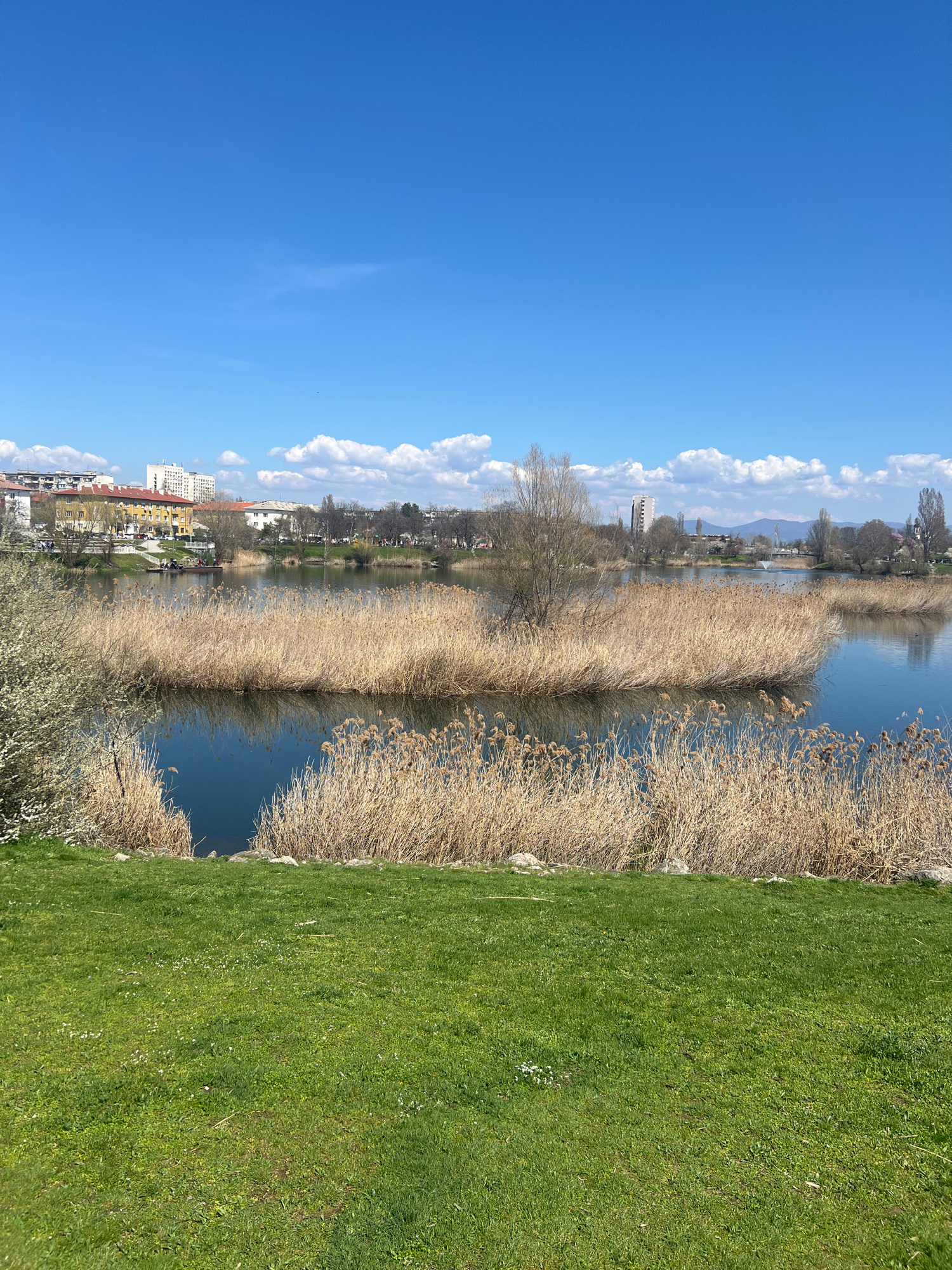The image depicts a landscape in Sofia, Bulgaria. In the foreground, there is a patch of green grass. Next to it, a line of tall, dried reeds borders the edge of a body of water, likely a lake or rive…read more