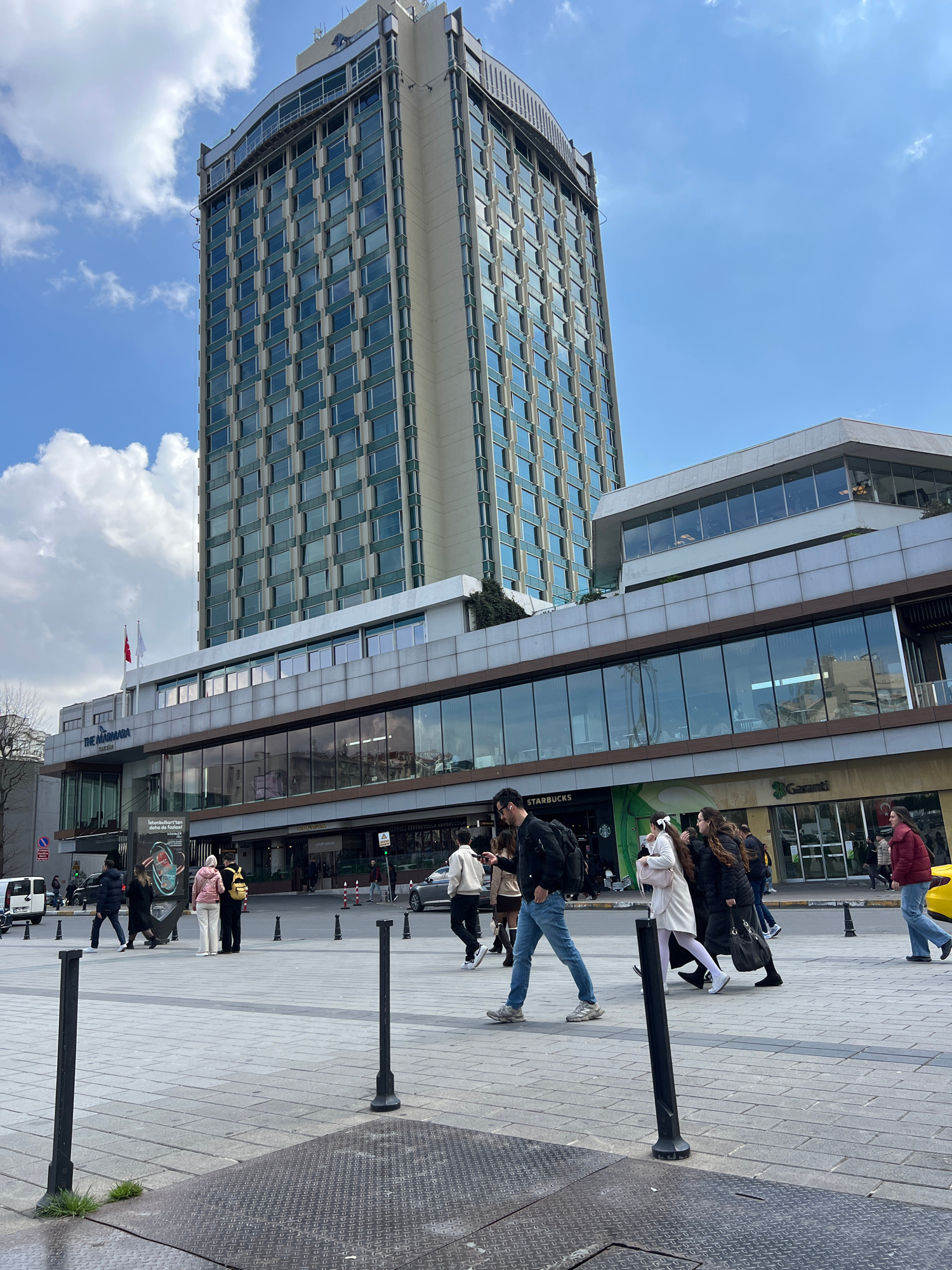 The image captures an urban scene in Beyoğlu, Turkey, featuring a mix of modern architecture and pedestrian activity. **Environment:** The scene is set on a paved pedestrian walkway adjacent to a mul…read more