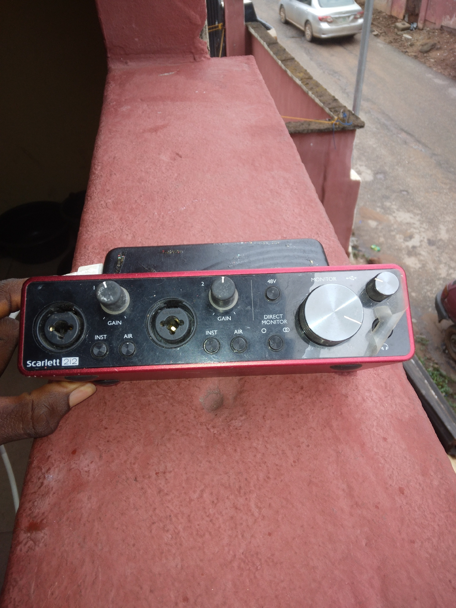 The image shows a Focusrite Scarlett 2i2 audio interface resting on a red painted surface. The interface is a rectangular device with a red casing and a black front panel. On the front panel, there ar…read more