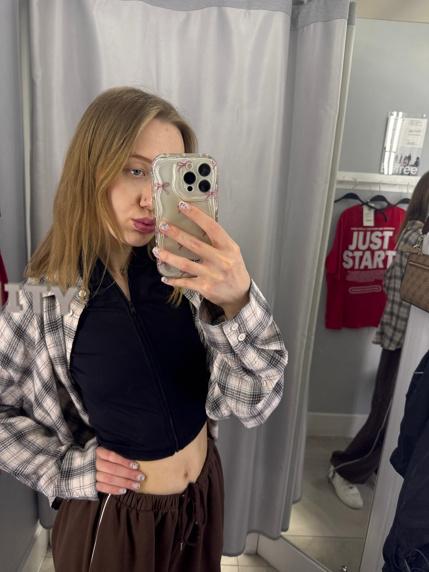 A young woman is taking a selfie in what appears to be a fitting room. She is wearing a black crop top, brown sweatpants, and a plaid shirt. She has long blonde hair and is holding her phone up to tak…read more