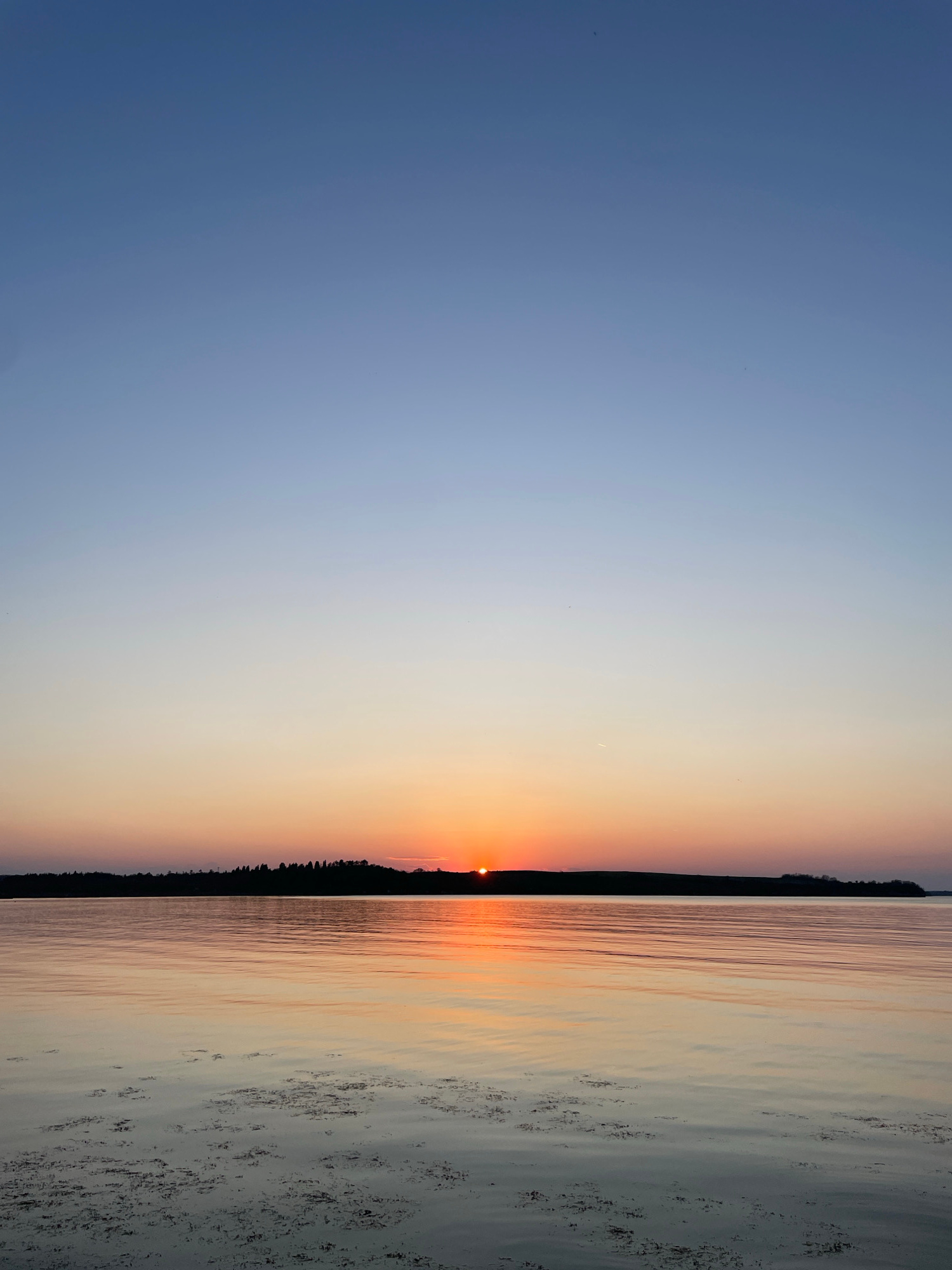 The image shows a sunset scene, likely over a body of water, potentially a lake or the sea. The sky transitions from a deep blue on the left to a light orange and yellow near the horizon. The sun appe…read more